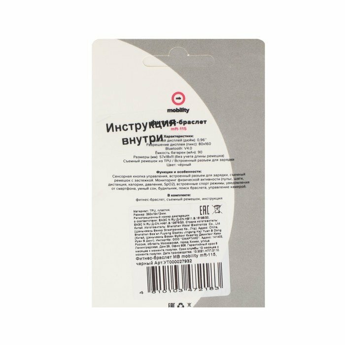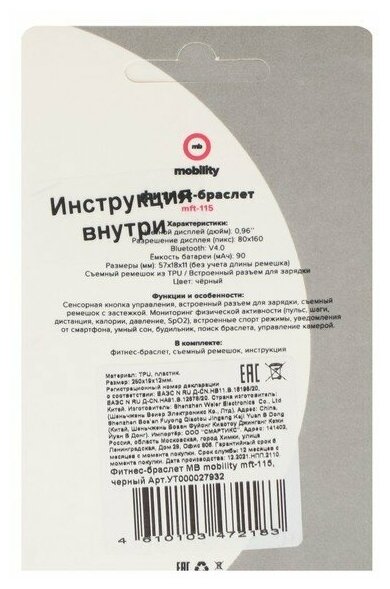 Фитнес-браслет MB Mobility mft-115, цветной дисплей, пульсометр, оповещения, шагомер, черный (комплект из 2 шт) интересное: