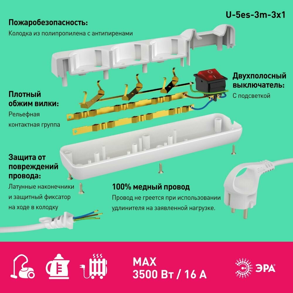 Удлинитель ЭРА U-5es-3m, 5 розеток, с/з, 16А / 3500 Вт 5 3 м 1 м² белый