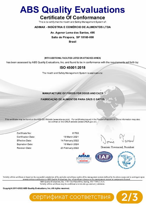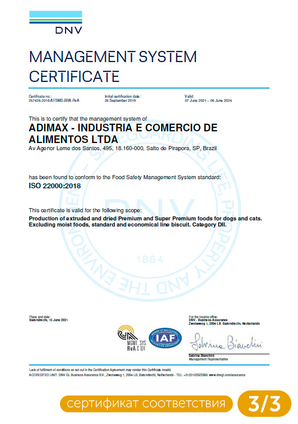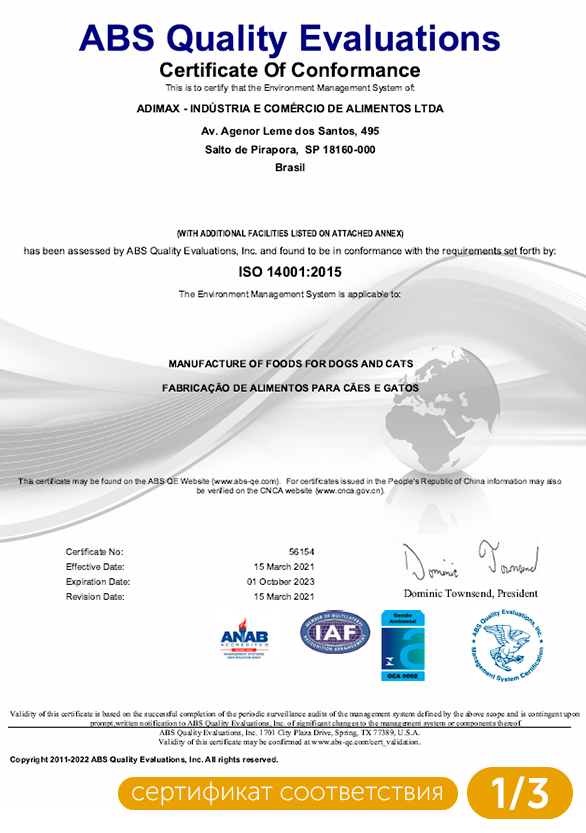 | Состав | Мука из мяса курицы, мука из лосося, дробленый рис, пшеничные отруби, изолят свиного белка, куриный жир, масло лосося, волокна сахарного тростника, семена льна, натуральный усилитель вкуса, обезвоженные фрукты и овощи (манго, яблоко, морковь, томаты), свекольный жом, хлорид натрия, мука из морских водорослей Schizochytrium sp., пребиотики (маннанолигосахариды, фруктоолигосахариды и инулин), экстракт Юкки Шидигера (Yucca schidigera) (0,04%), витамины (A, D3, E, K3, C, B1, B2, B6, B12, биотин, пантотенат кальция, фолиевая кислота, ниацин, хлорид холина), минералы (железо, медь, кальций, калий, цинк, марганец, селен, натрий), гексаметафосфат натрия, регулятор кислотности, пропионовая кислота, таурин, экстракты растений (зеленый чай, розмарин, мята), экстракт токоферола (природный антиоксидант) (0,01%). |