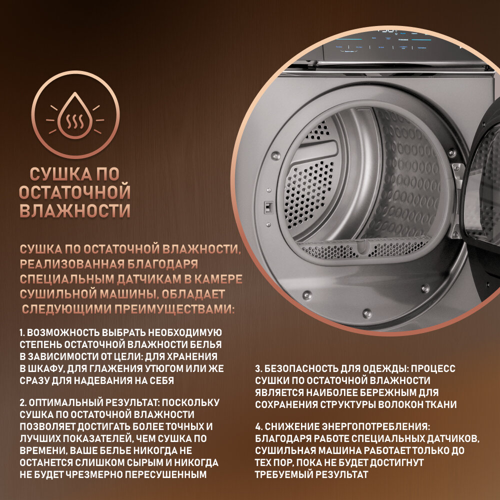 | Плюсы: | Современный дизайн, большое количество программ, вместительный объем барабана, идеально подходит для сушки большого объема белья, тихая и экономичная. |