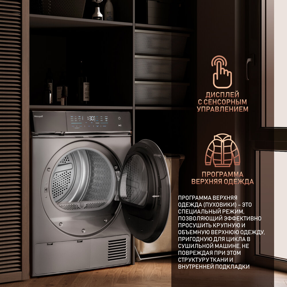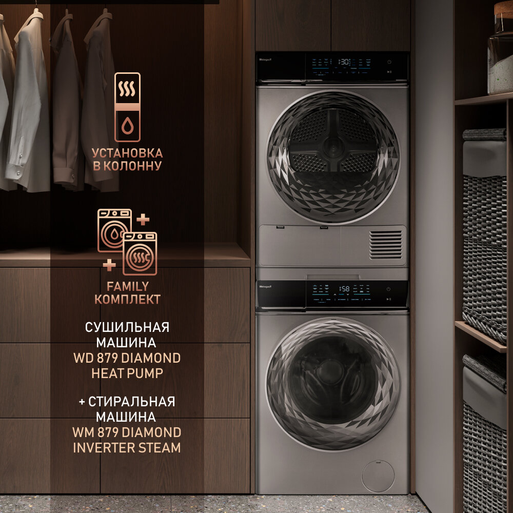 Купить Сушильная машина с инвертором Weissgauff WD 879 Diamond Heat Pump 3 года гарантии, Инвертор, Тепловая помпа, Сенсорный дисплей, Установка в колонну