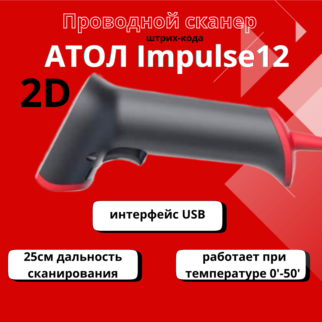 Сканер 2D АТОЛ IMPULSE 12. Сканер штрих-кодов и QR-кодов (проводной,2D, чёрный, USB, без подставки)