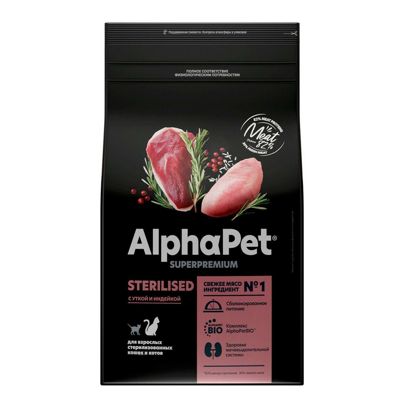 Сухой корм Alphapet Superpremium для взрослых стерилизованных кошек с уткой и индейкой, 1,5 кг