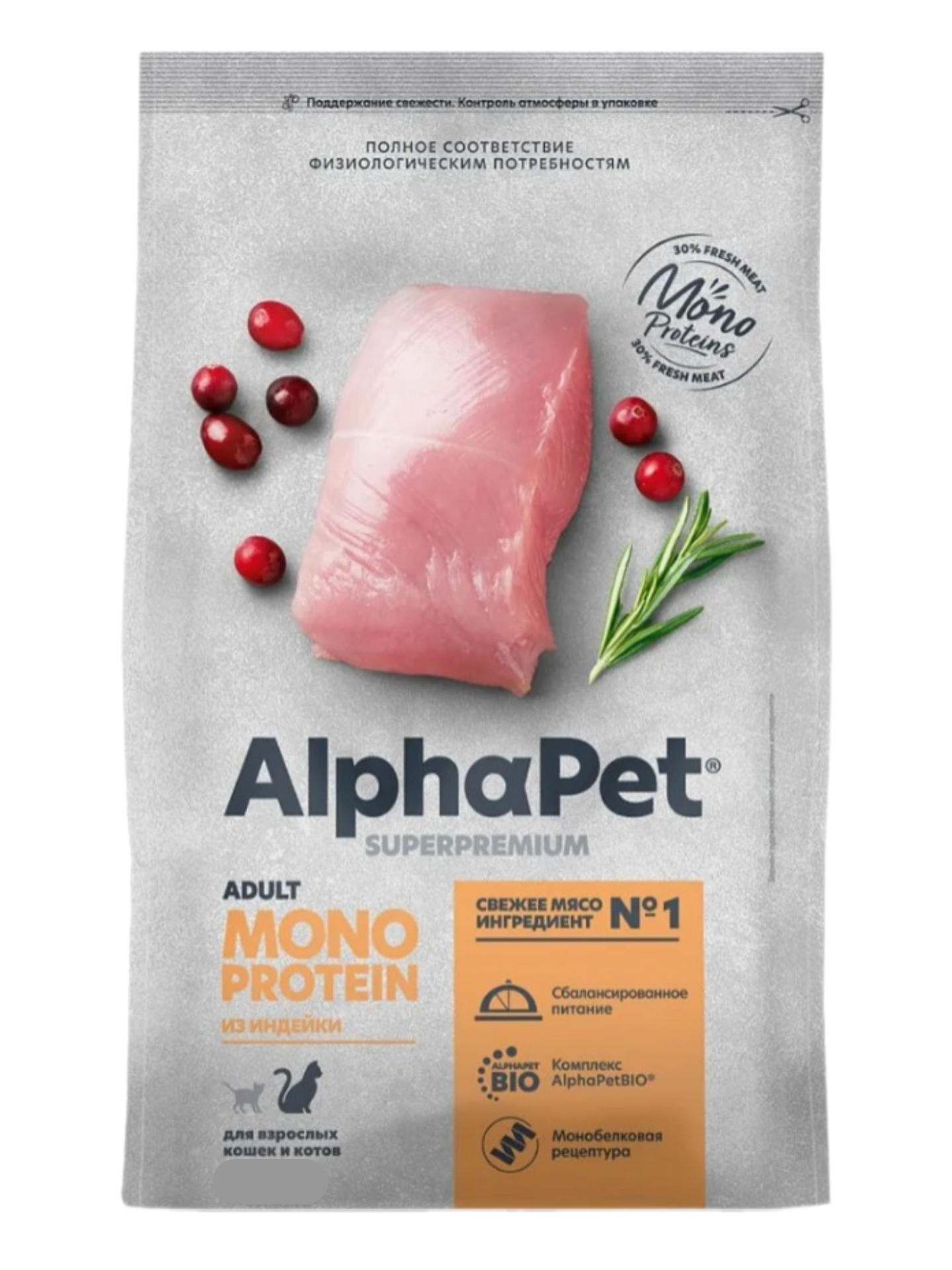 AlphaPet Monoprotein Superpremium Сухой корм для взрослых кошек, с индейкой, 400 гр.