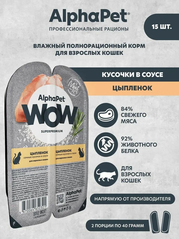 Влажный полнорационный корм для взрослых кошек AlphaPet WOW Superpremium, Цыпленок сочные кусочки в соусе, 80г * 15 шт