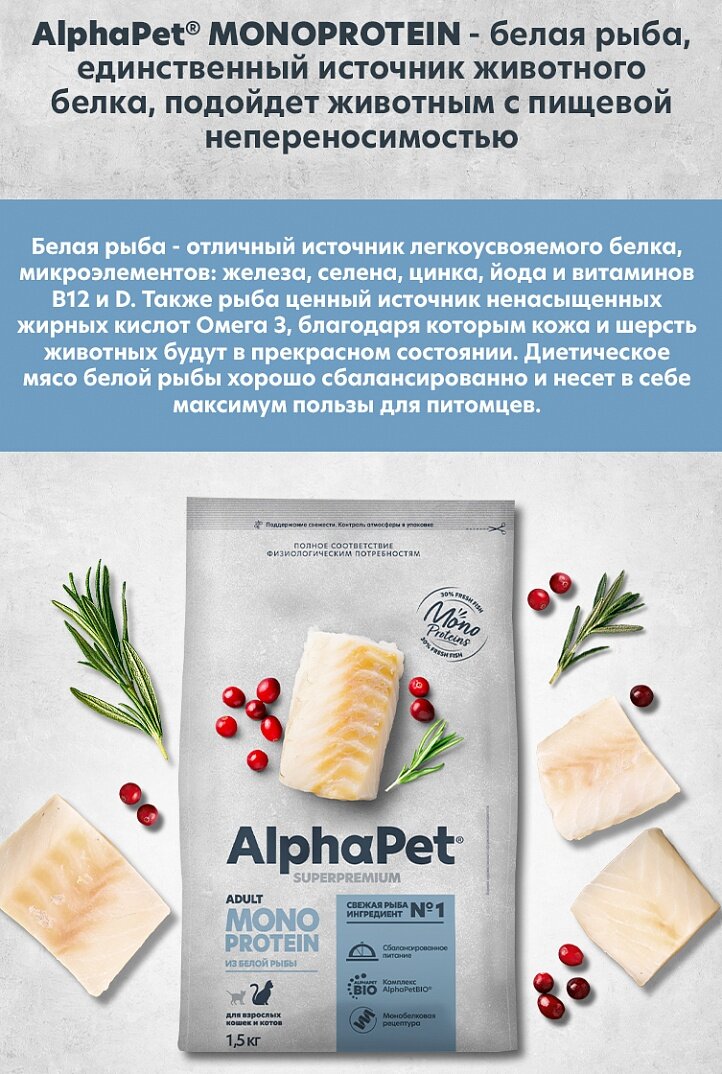 Сухой полнорационный корм MONOPROTEIN из белой рыбы для взрослых кошек AlphaPet Superpremium 1,5 кг