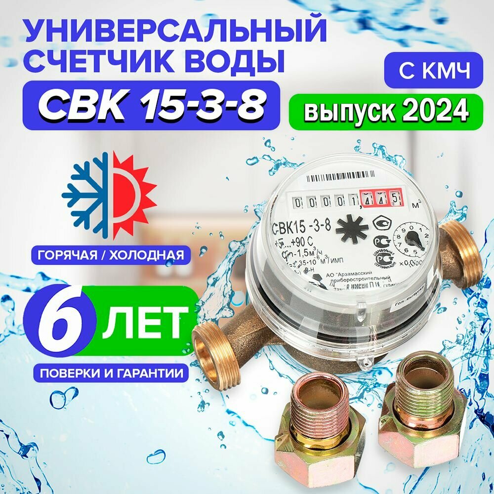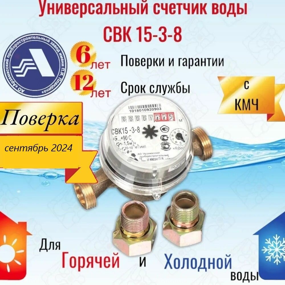 Счетчик воды универсальный для холодной и горячей воды Арзамас АПЗ СВК 15-3-8 с монтажным комплектом, поверка: июль 2023г.