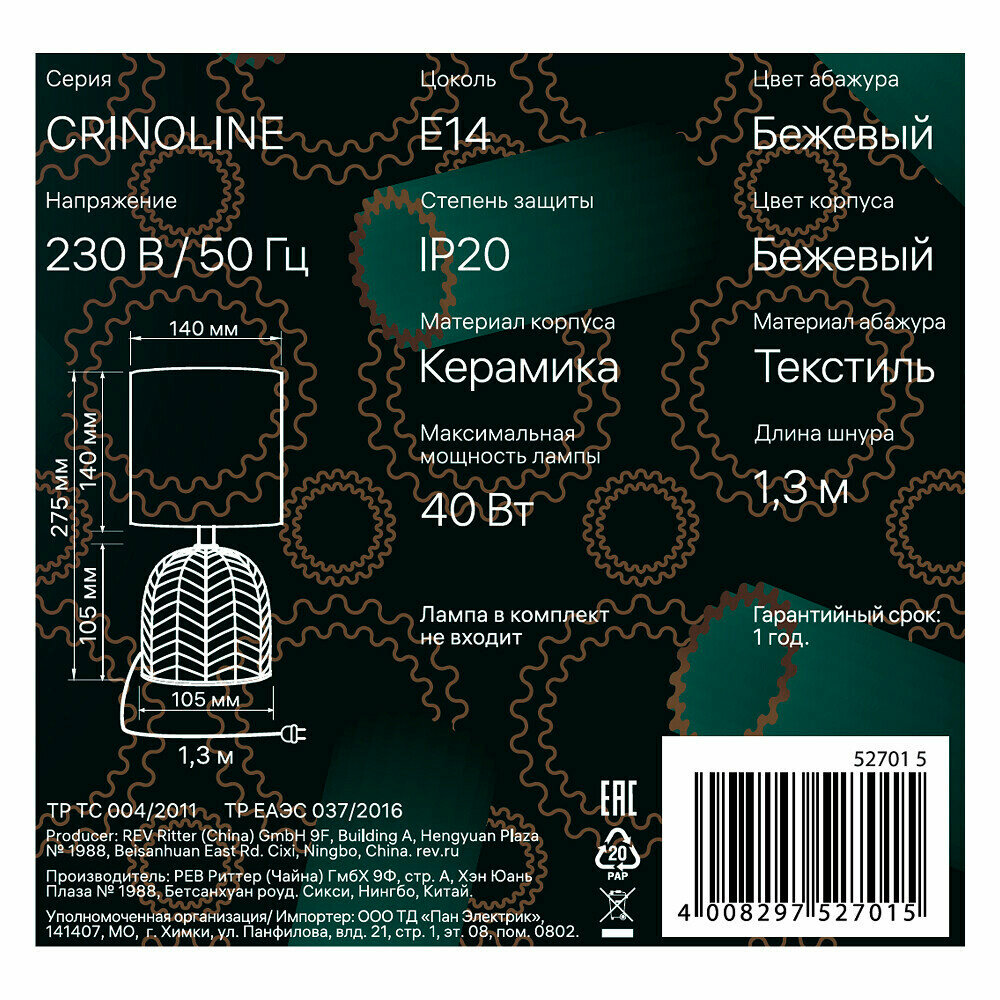 Настольная лампа Ritter Crinoline 1xE14, провод 1,3м, бежевая