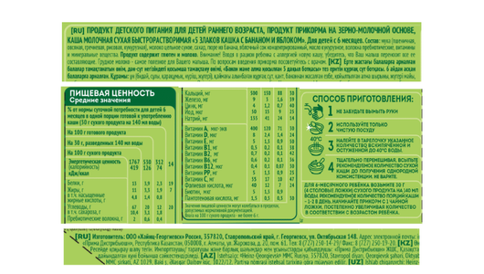 | Состав | мука (пшеничная (18%), овсяная (12%), гречневая (6%), рисовая (6%), кукурузная (5%)), молоко цельное сухое (28%), сахар (11%), банановое пюре, яблочный сок концентрированный (4%), масло кукурузное, волокна цикория пребиотические (инулин), порошкообразно-инкапсулированный очищенный рыбий жир, витамины и минеральные вещества |
