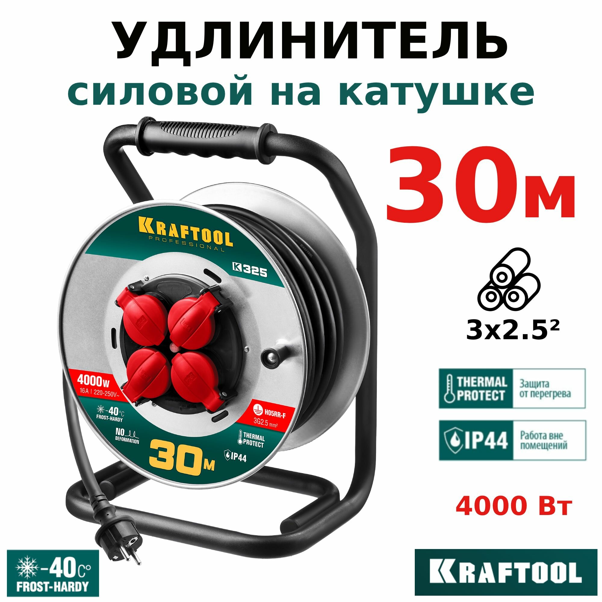 Силовой удлинитель на стальной катушке Kraftool КГ 3х2.5 30м 4000Вт Ip44, K-325 Силовой удлинитель н