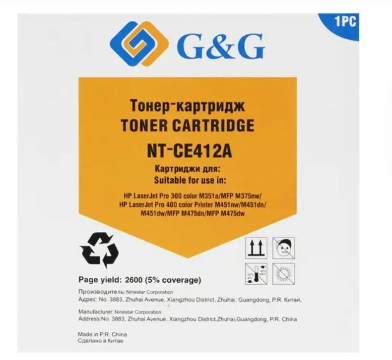 Картридж лазерный G&G GG-CE412A желтый (2600стр.) для HP LJ Pro 300 color M351a/MFP M375nw;Pro 400 c