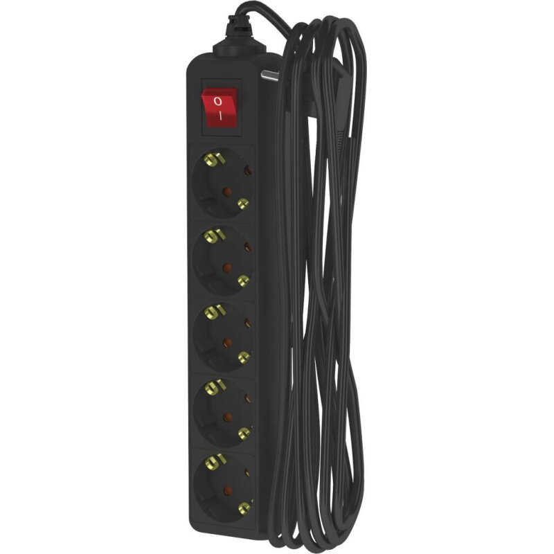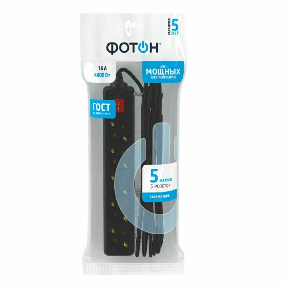 Сетевой удлинитель "фотон" 16-55ЕS, 5 м, 5 розеток, 16 А, с выключателем, с заземлением, чёрный