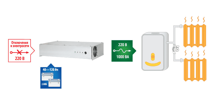 | Плюсы: | Мощность 800 Ватт, хватает для котла и наосов. При выключении электричества скачка напряжения нет, котел и насосы не выключаются. |