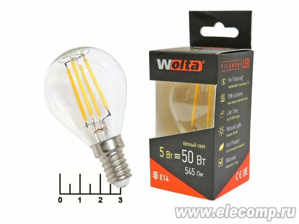 Лампа светодиодная 220V 5W E14 3000K белый теплый шар G45 прозрачная филаментная Wolta (45*74) интересное: