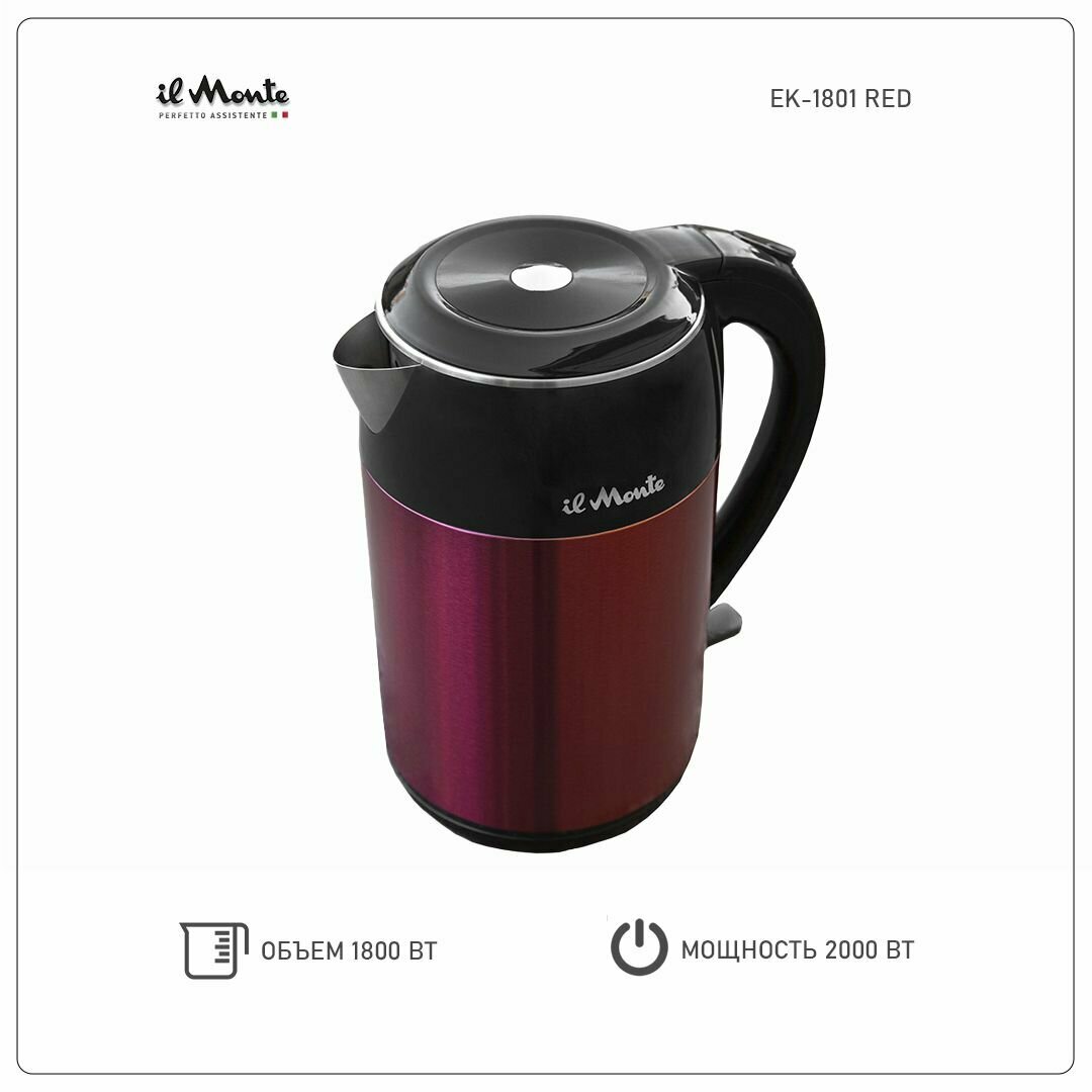 Чайник электрический Премиум с адиабатным покрытием, Контактная группа (электроника) STRIX, Не нагревающийся, Полностью из нержавеющей стали, Литая стальная колба внутри, Объем 1,8 л., il Monte EK-1801 RED