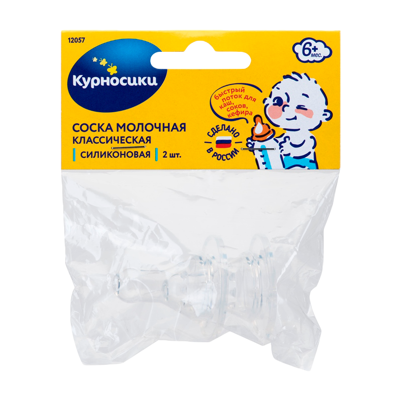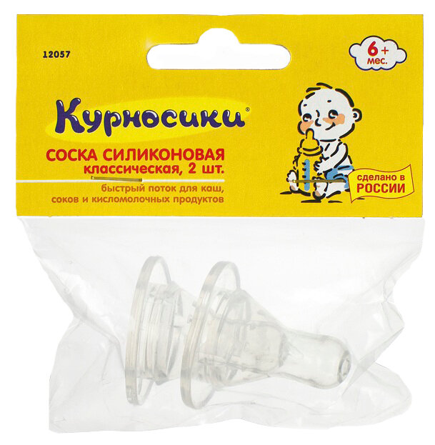Соска для кормления новорожденных / Курносики Соска молочная силиконовая классическая, быстрый поток, 6+, 2 шт.