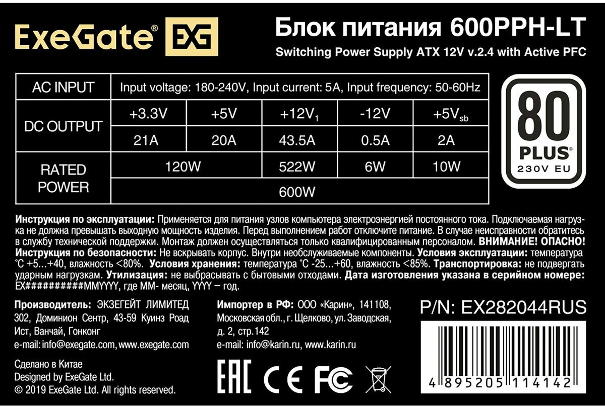 Блок питания ExeGate 600PPH-LT 80 PLUS 80+, 600 Вт, ATX, черный