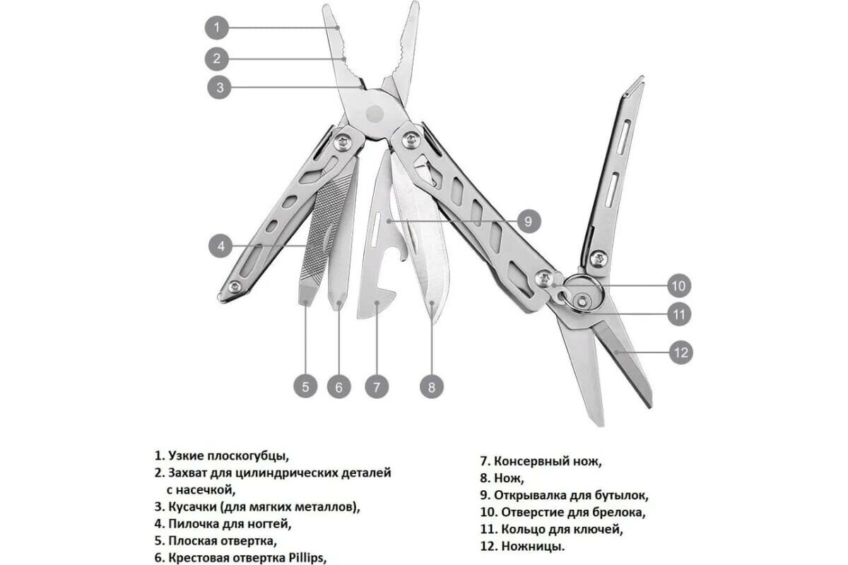 | Инструменты (функции) | кусачки / нож / отвертка / открывалка для бутылок / пассатижи / плоскогубцы |