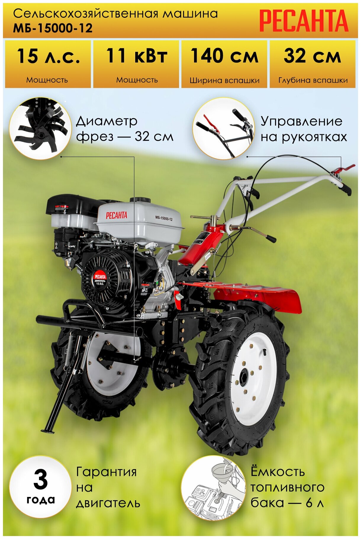 Ниже Вы можете прочитать отзывы на Мотоблок / Сельскохозяйственная машина Ресанта МБ-15000-12 (15 л.с., четырехтактный, бензин, бак – 6 л, ширина – 140 см), ознакомится с подробными характеристиками, посмотреть интересные обзоры и фотографии на Мотоблок / Сельскохозяйственная машина Ресанта МБ-15000-12 (15 л.с., четырехтактный, бензин, бак – 6 л, ширина – 140 см).