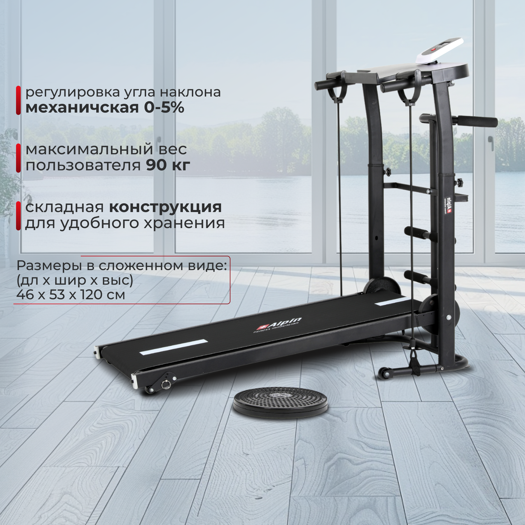 | Подробная комплектация | беговая дорожка; диск здоровья; эспандеры; упоры для ног |