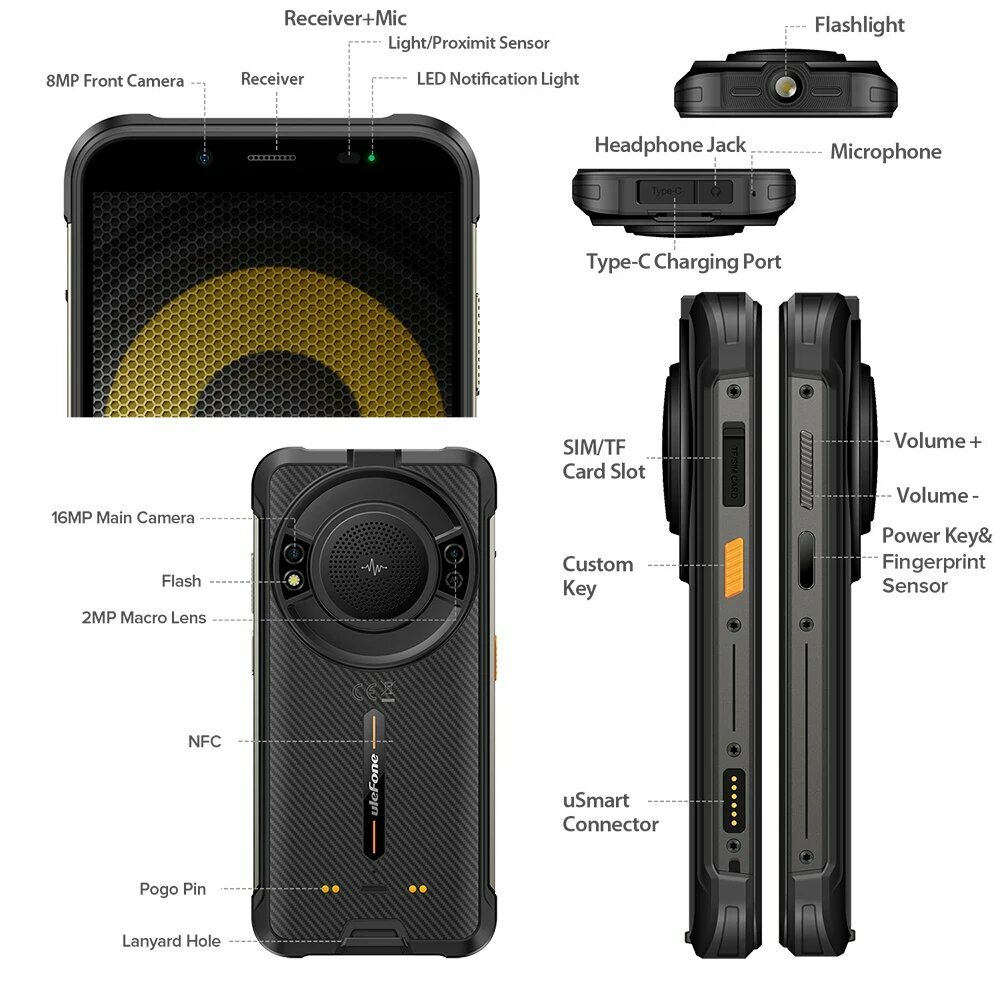 | Комплектация | Ulefone Power Armor 16 Pro, зарядное устройство, USB кабель, защитная пленка (предварительно установлена), защитная пленка для экрана из закаленного стекла, ремешок, игла для извлечения SIM-карты, многоязычное руководство пользователя, многофункциональная инструкция, гарантийный талон, инструкция по зарядке, карта безопасности |
