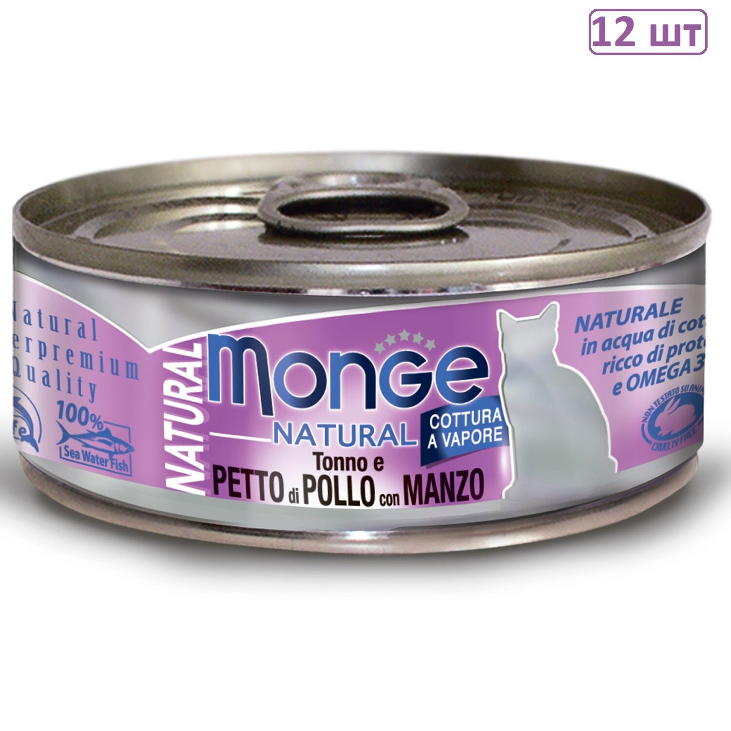 Влажный корм для кошек Monge Natural, с курицей, с говядиной, с тунцом 12 шт. х 80 г