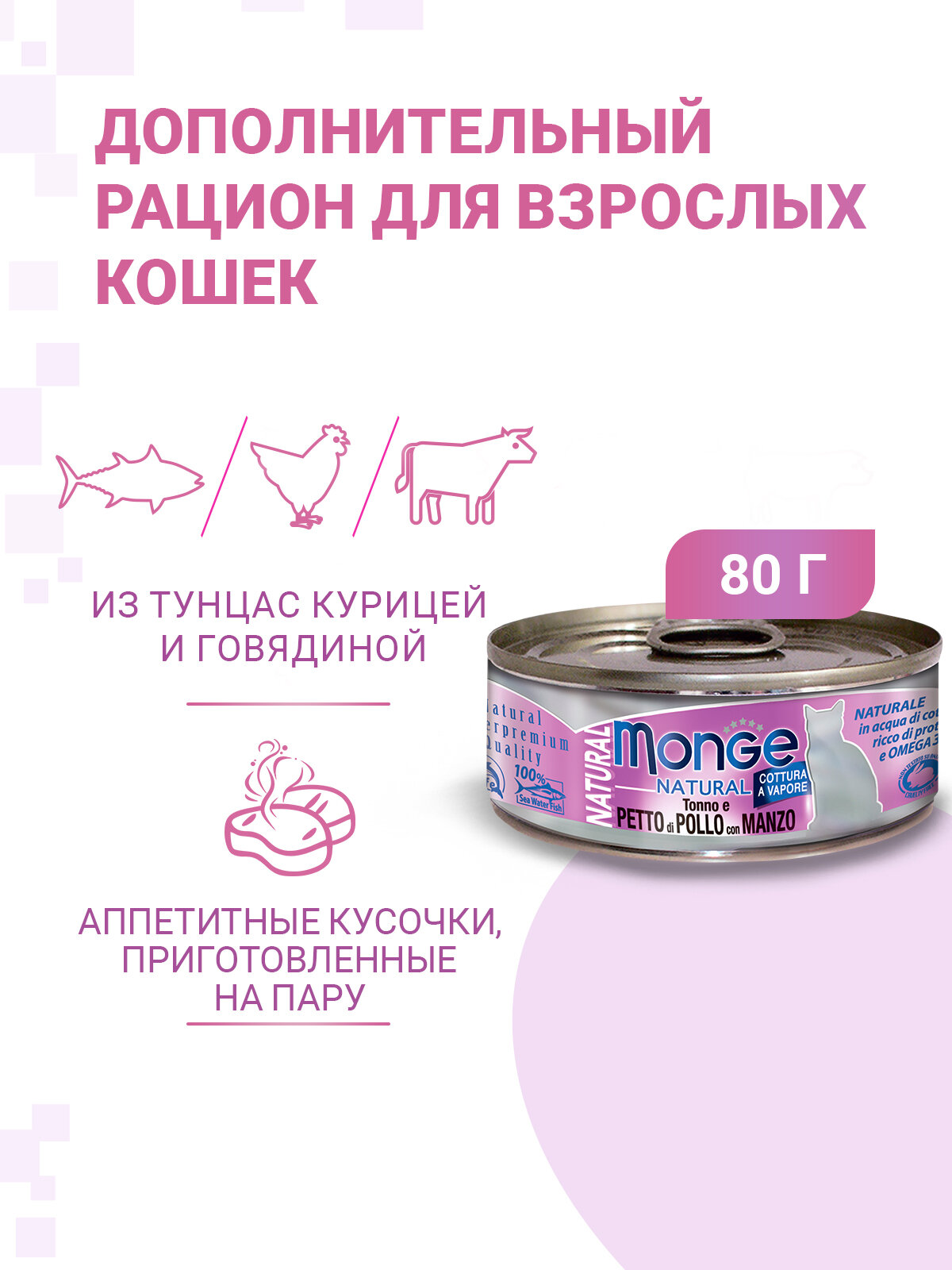 Влажный корм Monge Cat Natural для кошек, из тунца с курицей и говядиной, консервы 80 г