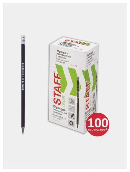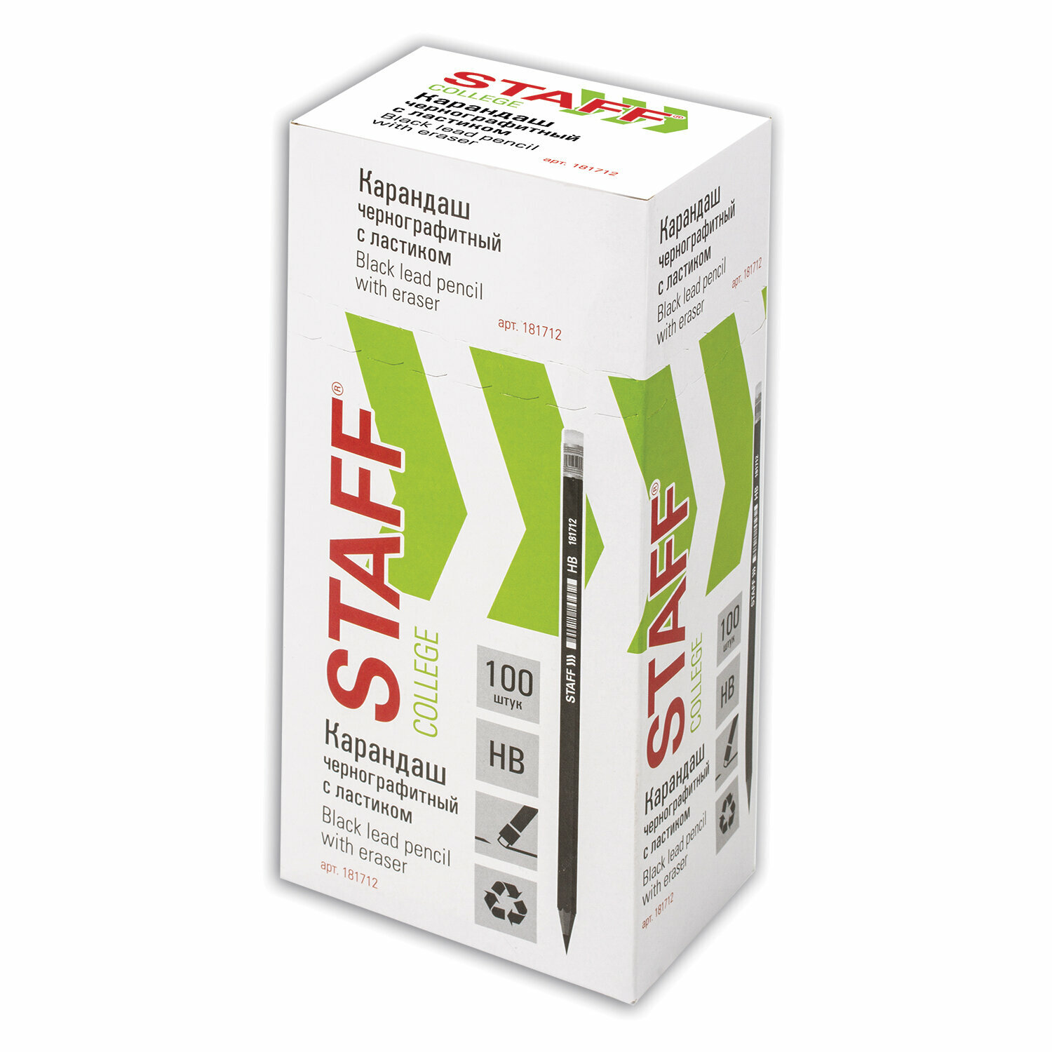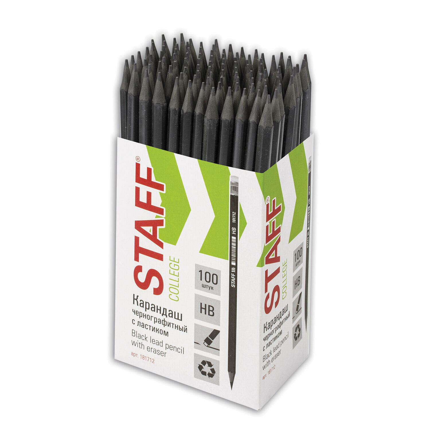 Карандаш чернографитный (простой) Staff College (НВ, с ластиком, пластик, корпус черный) 100шт. (181712)