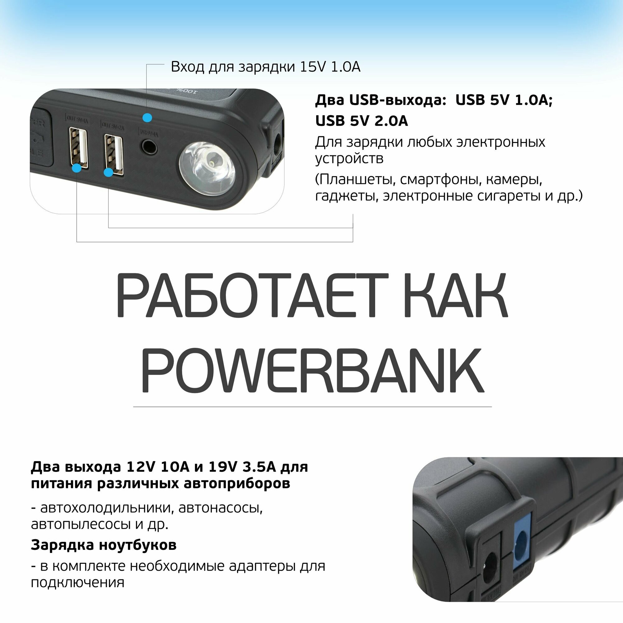 | Плюсы: | Когда нужно срочно ехать, а аккумулятор по какой-то причине подводит - это устройство как волшебная палочка легко заводит двигатель! И заряда хватает более, чем на 3 раза использования в день. Как бонус - еще и телефон быстро может зарядить. Подзарядка самого устройства - 1 раз в 3 месяца. |