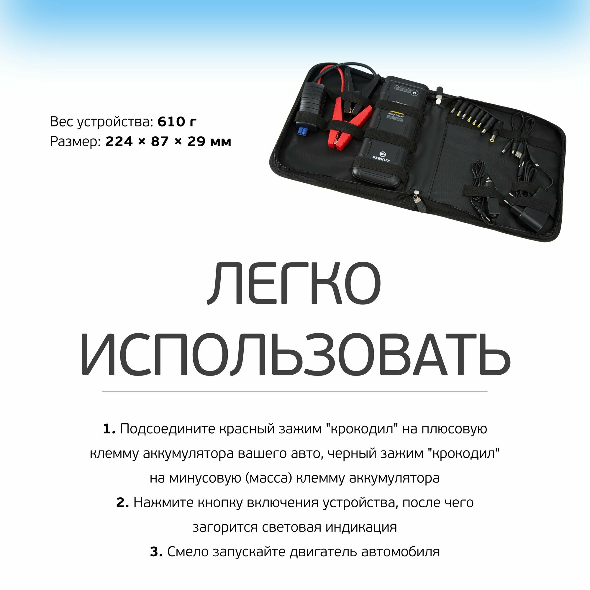 | Минусы: | Коротковаты провода, подсоединяемые к клеммам аккумулятора. Из-за этого не очень удобно и надёжно подключать крокодилы на клеммы. Нет кабелей под Тайп-Си и Мини-ЮСБ. Коротковато время, отведённое на запуск двигателя после подключения. Внутри Литий-полимерные батареи. Чтобы завести двигатель зимой, зарядное устройство необходимо держать в тепле или предварительно отогреть на пузе).. |