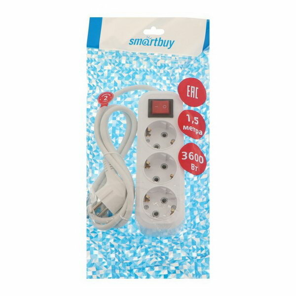 Удлинитель Smartbuy, 3 розетки, 1.5м, 16А, 3500Вт, ПВС 3х1 мм2, с з/к, с выкл., белый