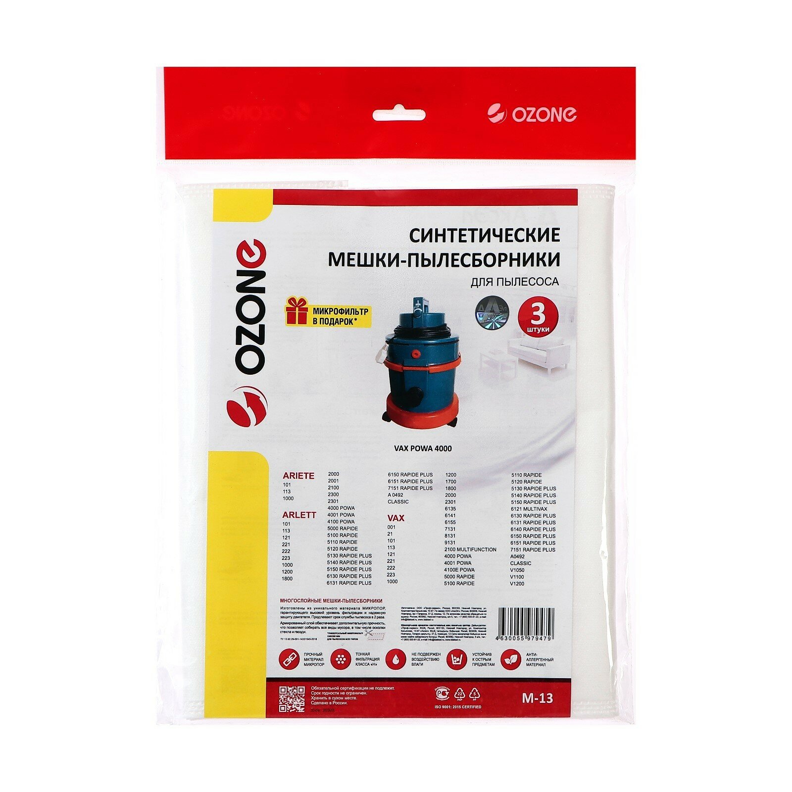 Мешок-пылесборник M-13 Ozone синтетические для пылесоса, 3 шт + микрофильтр интересное: