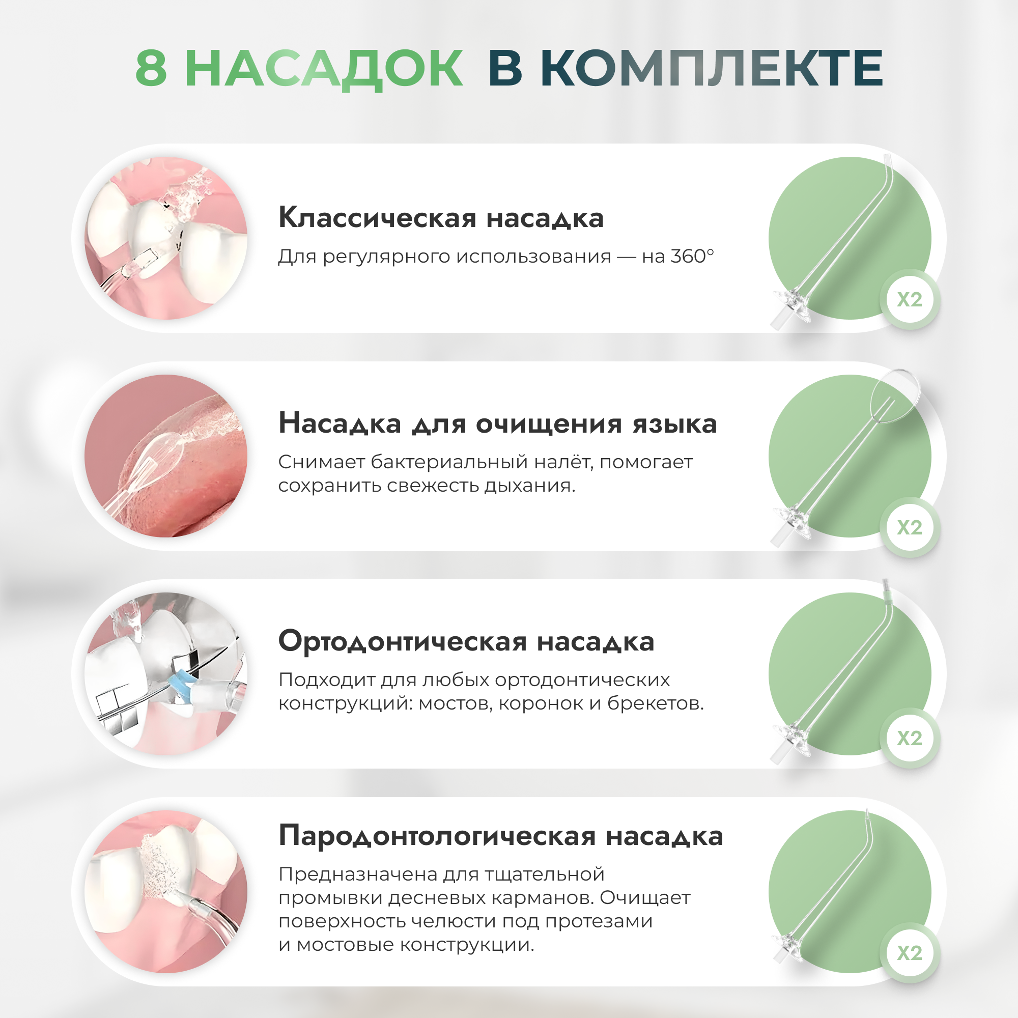 | Минусы: | Насадка для имплантов не фиксируется дискретно по оси. Вращается по оси при ведении вдоль зубов. Приходится останавливать ирригатор и поправлять насадку. |