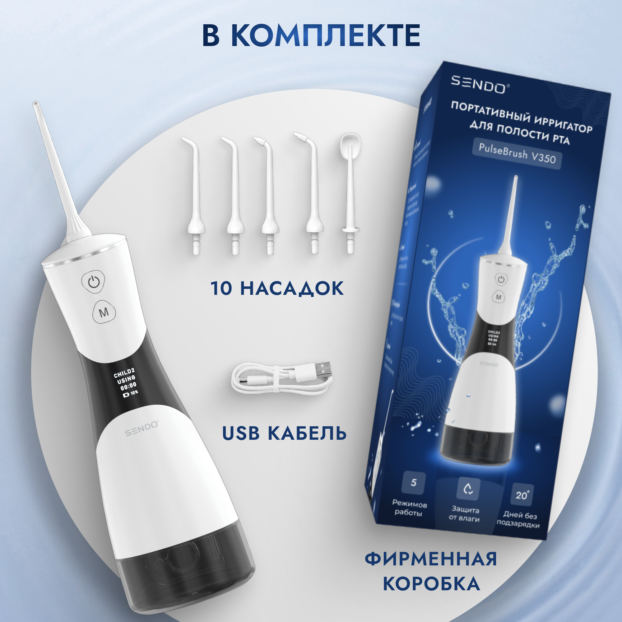 Портативный ирригатор для полости рта SENDO PulseBrush V150 + набор насадок