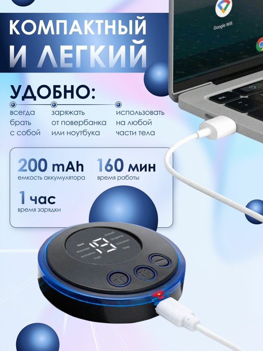 | Минусы: | Быстро разряжается и не заряжается. Дешёвая китайская дешёвка. Нет индикатора зарядки. После несколько использований просто перестал заряжаться и упала интенсивность массажа. Нет инструкции на русском языке. Нет гнезда для зарядки от батареек. Да и липкая электродная лента оставляет желать лучшего. Через несколько сеансов уже надо поддерживать. |