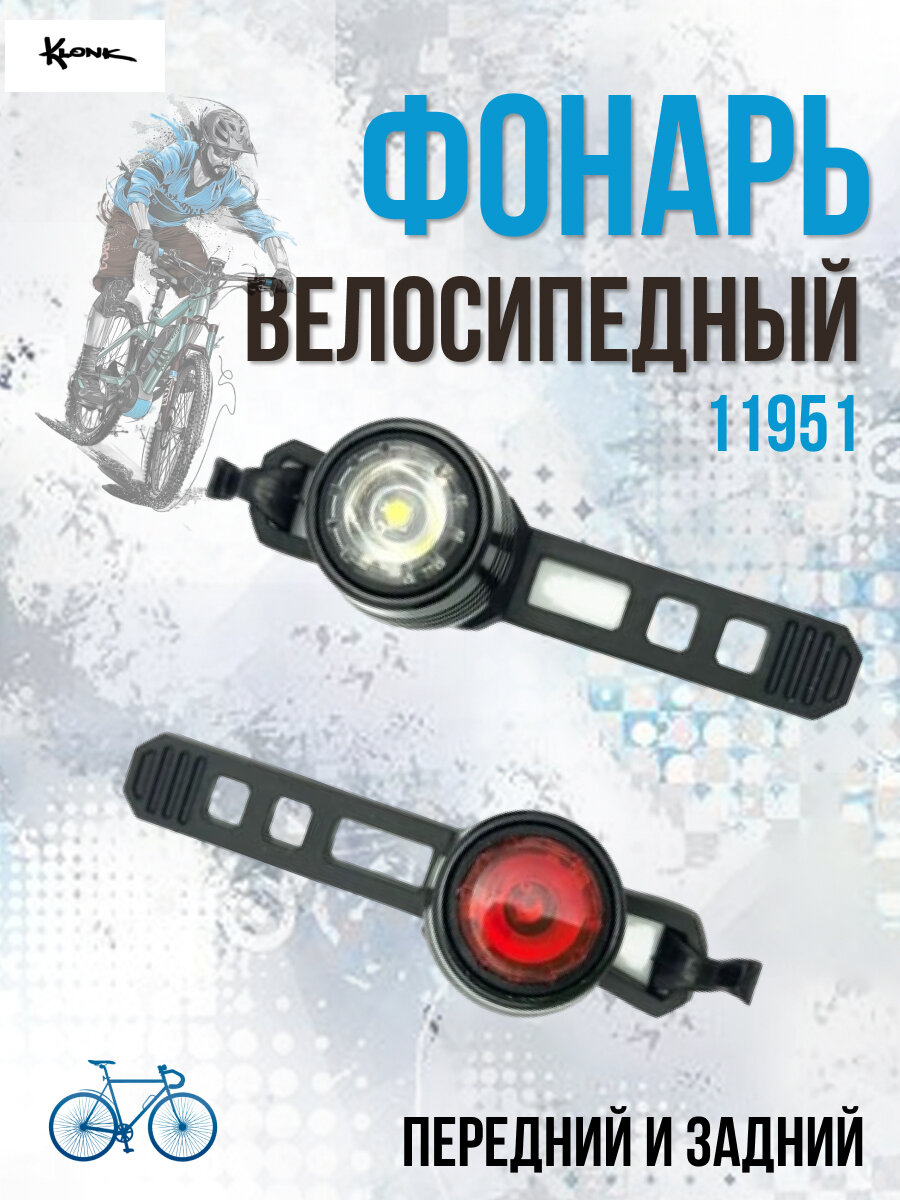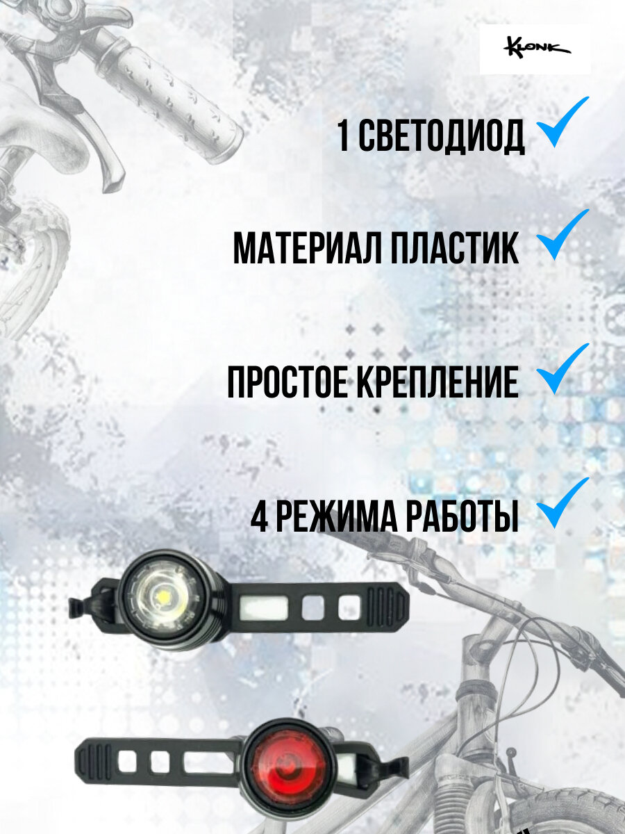 Комплект фонарей передний и задний Klonk 11951, аккумулятор 220 mAh, 3 режима работы, USB кабель в комплекте интересное: