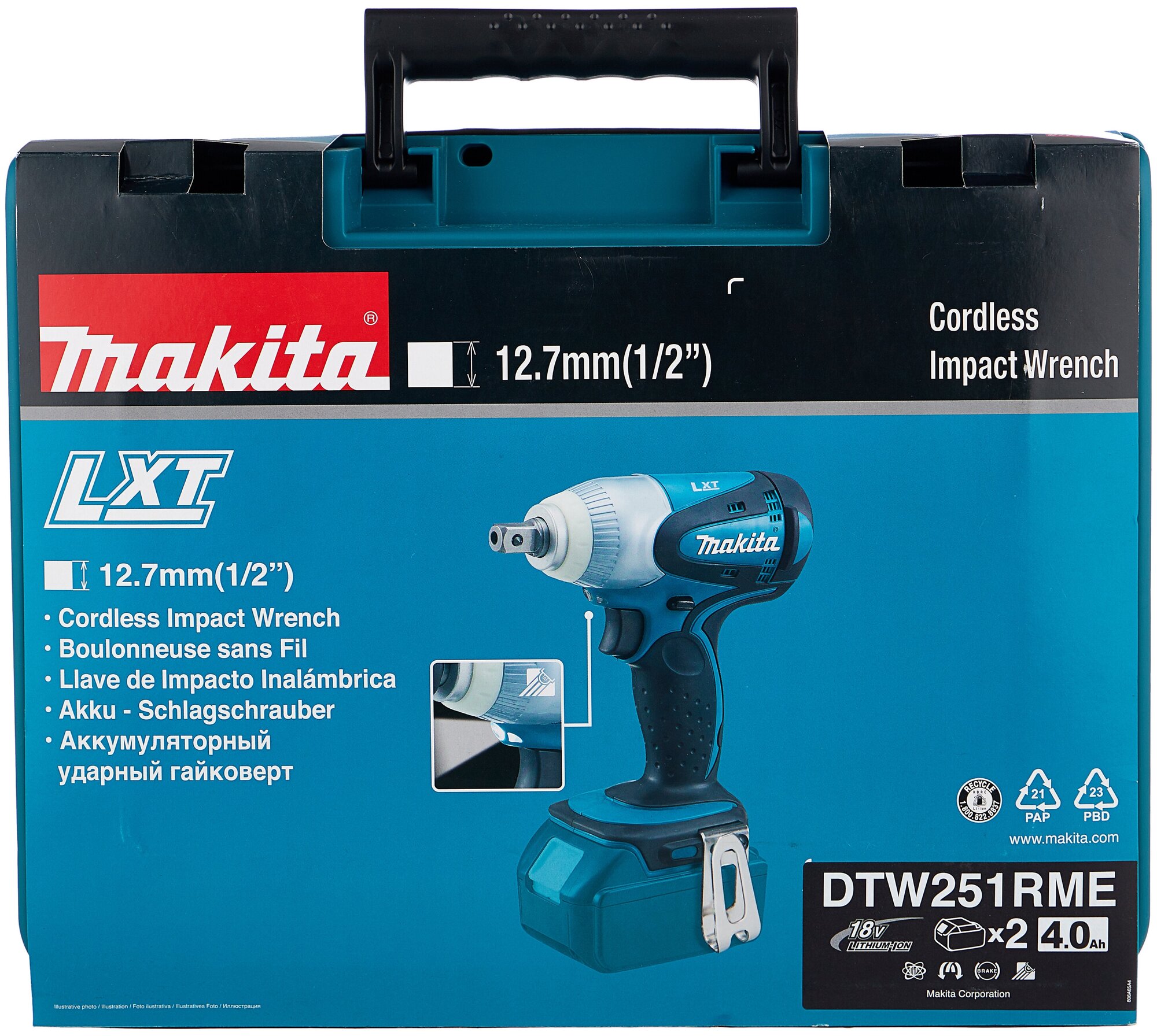 Гайковёрт аккумуляторный ударный MAKITA DTW251RME (18 В, 230нм, 1/2", 1,7кг, 2акк.Li-ion.4Ач, кейс)