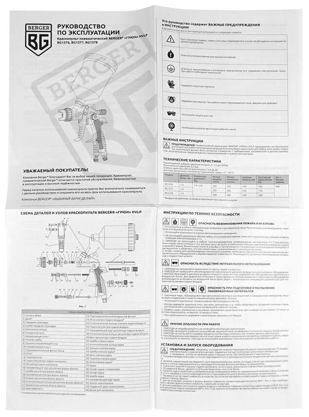 Краскопульт пневматический BERGER 'грюн' HVLP, 1.3мм, 0,6л, в/б (BG1376) интересное: