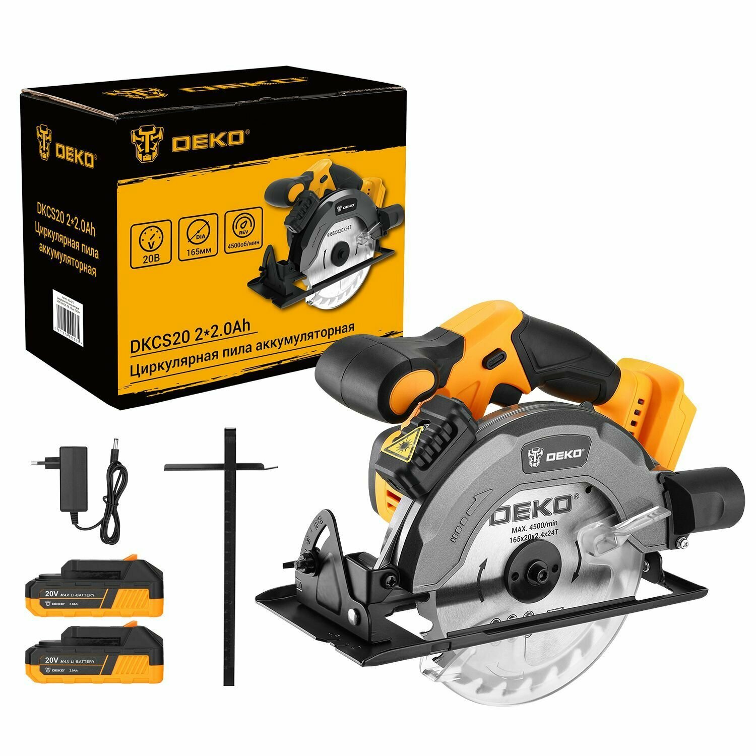 Пила циркулярная аккумуляторная Deko DKCS20 Laser 20В 165мм 2*2.0Ач черно-желтый