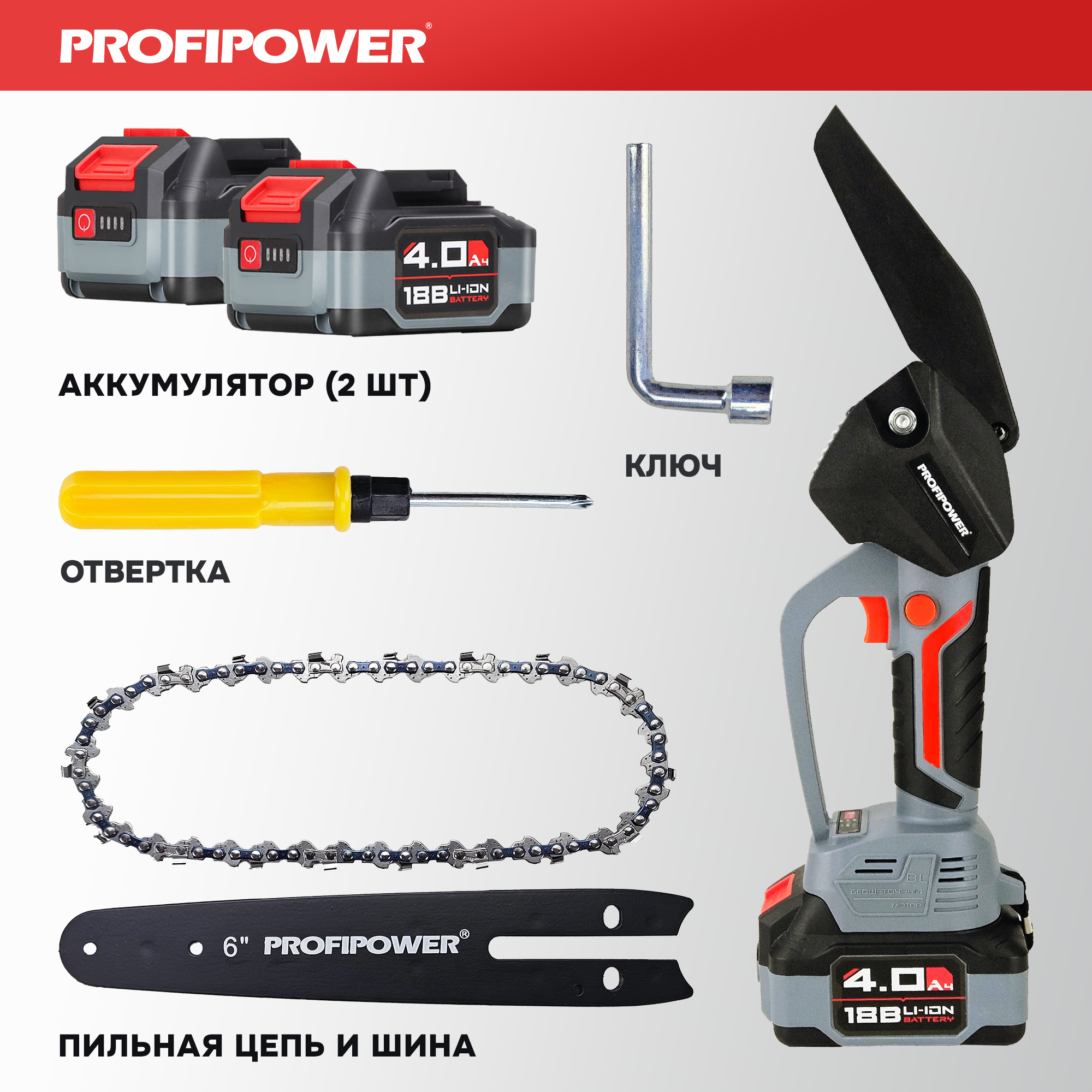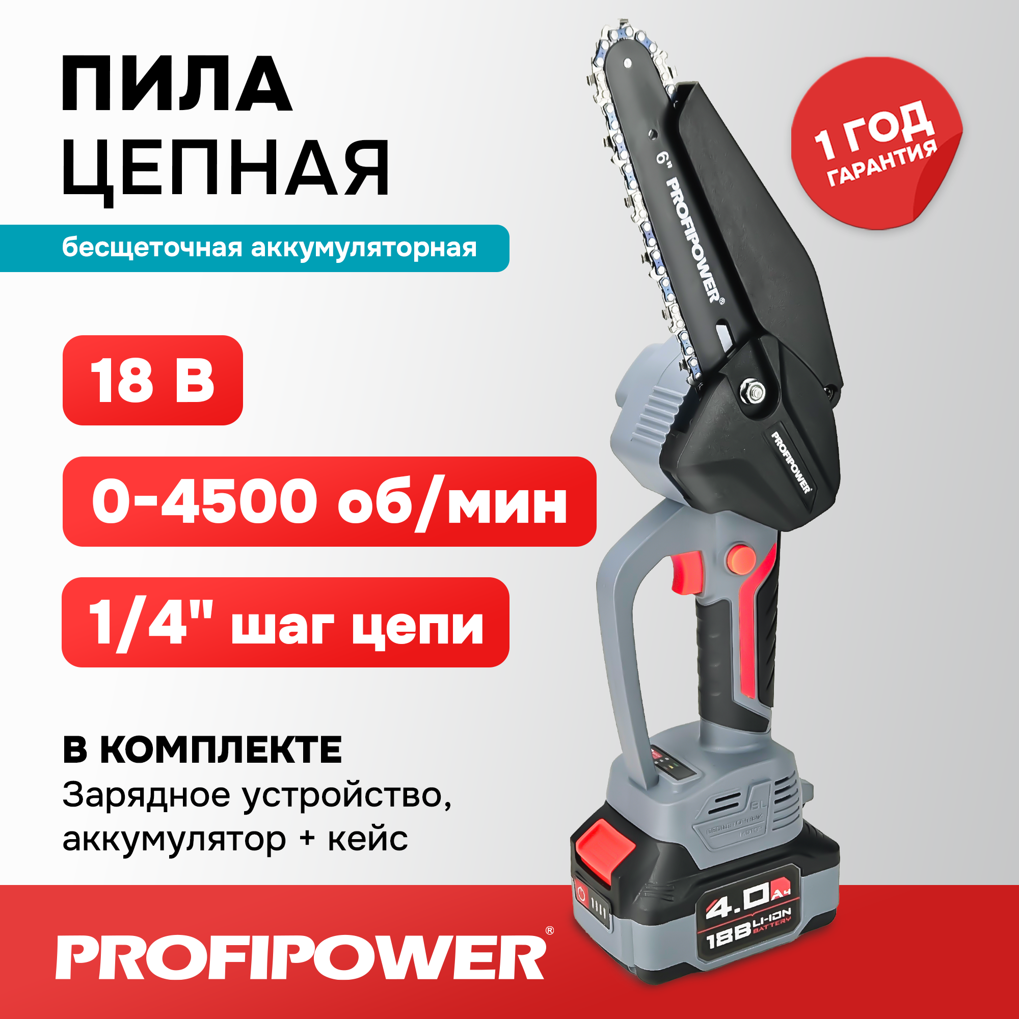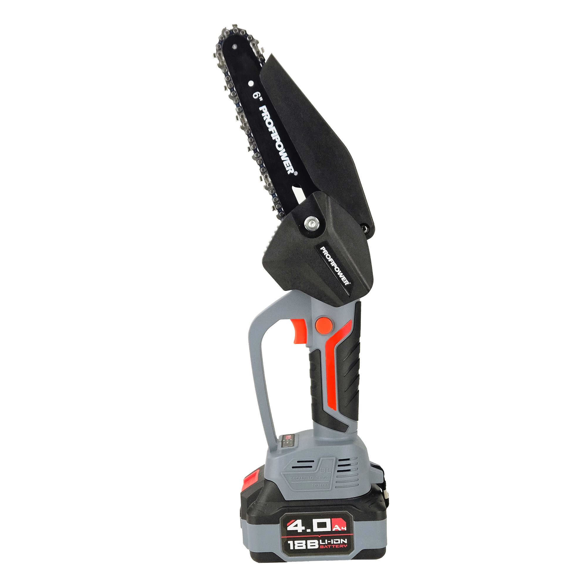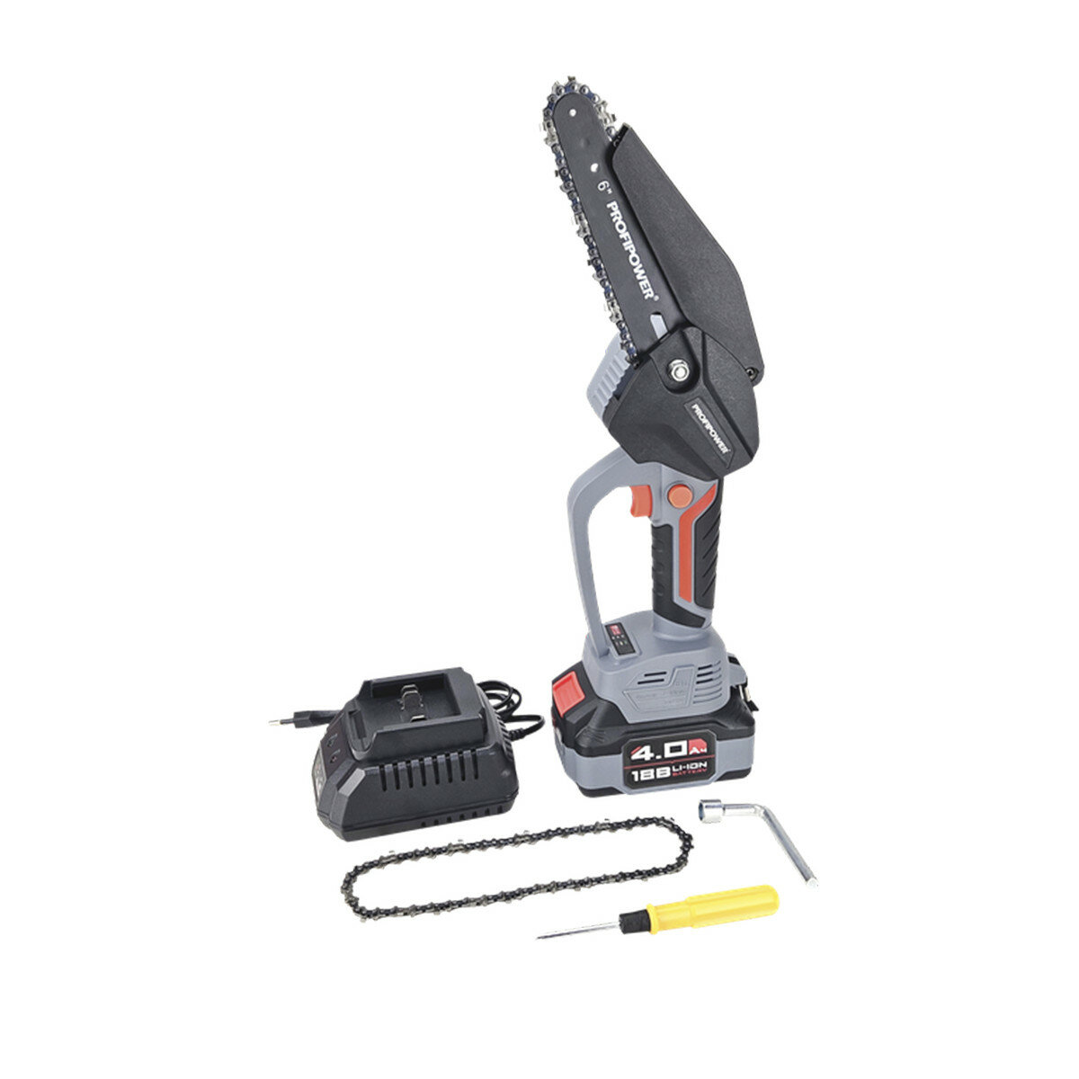 Цепная пила ProfiPower MKGST-18V (Li-ion-1шт, 4.0Ач,15см, 6",0-4500 об/мин,шина, цепь, З/У)