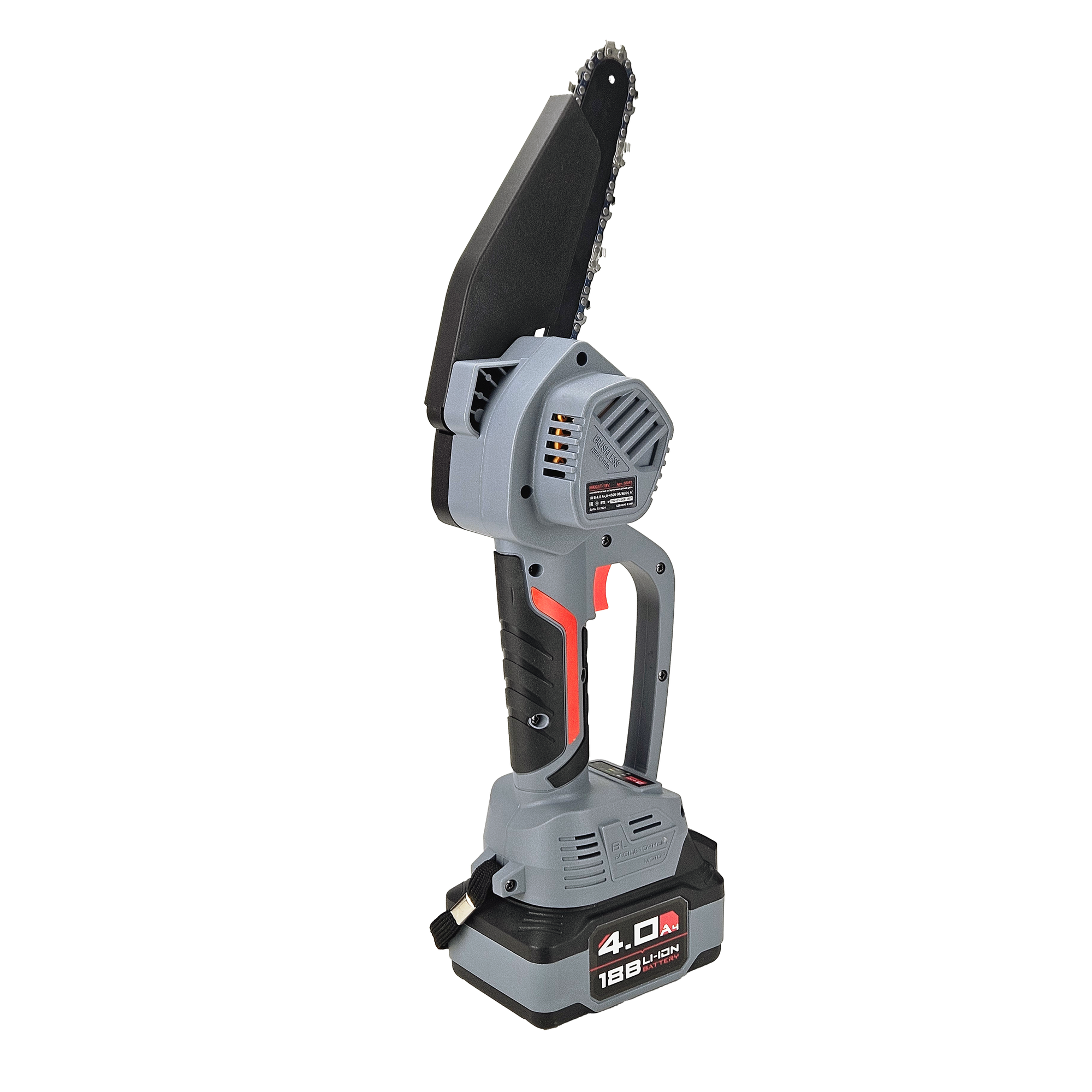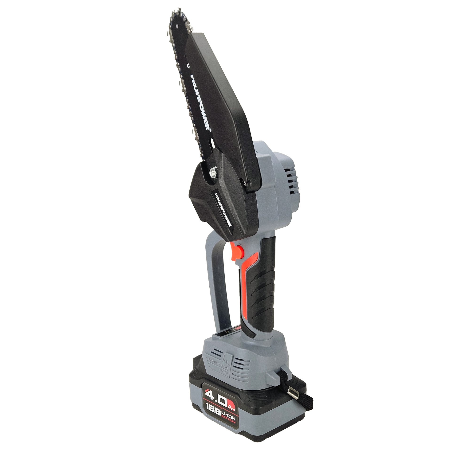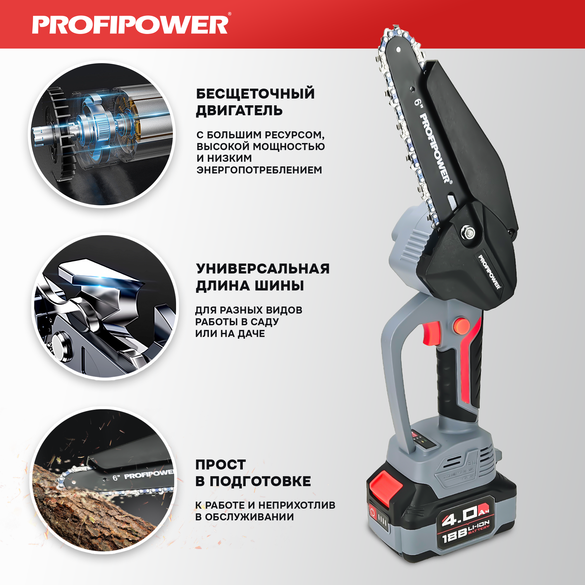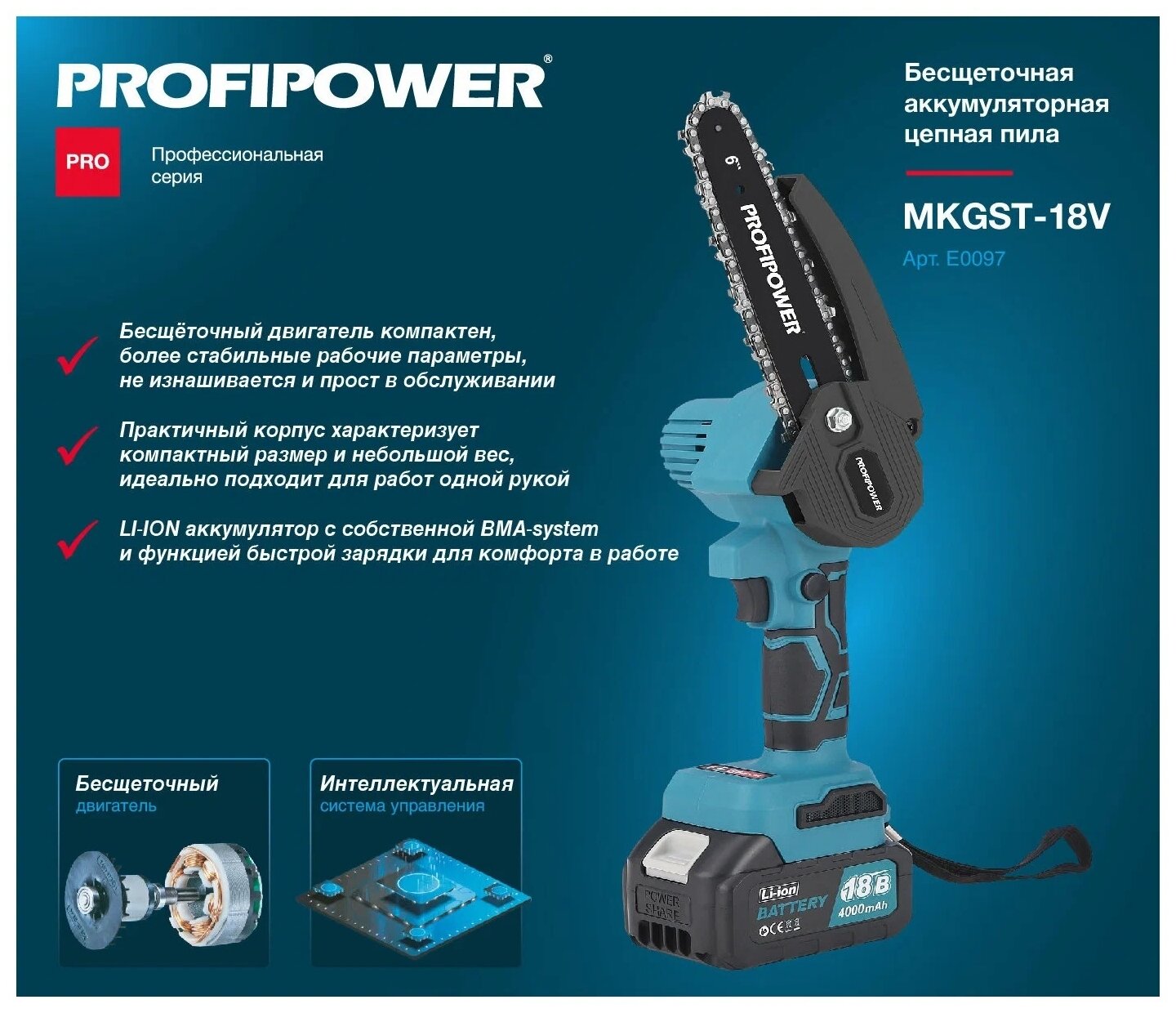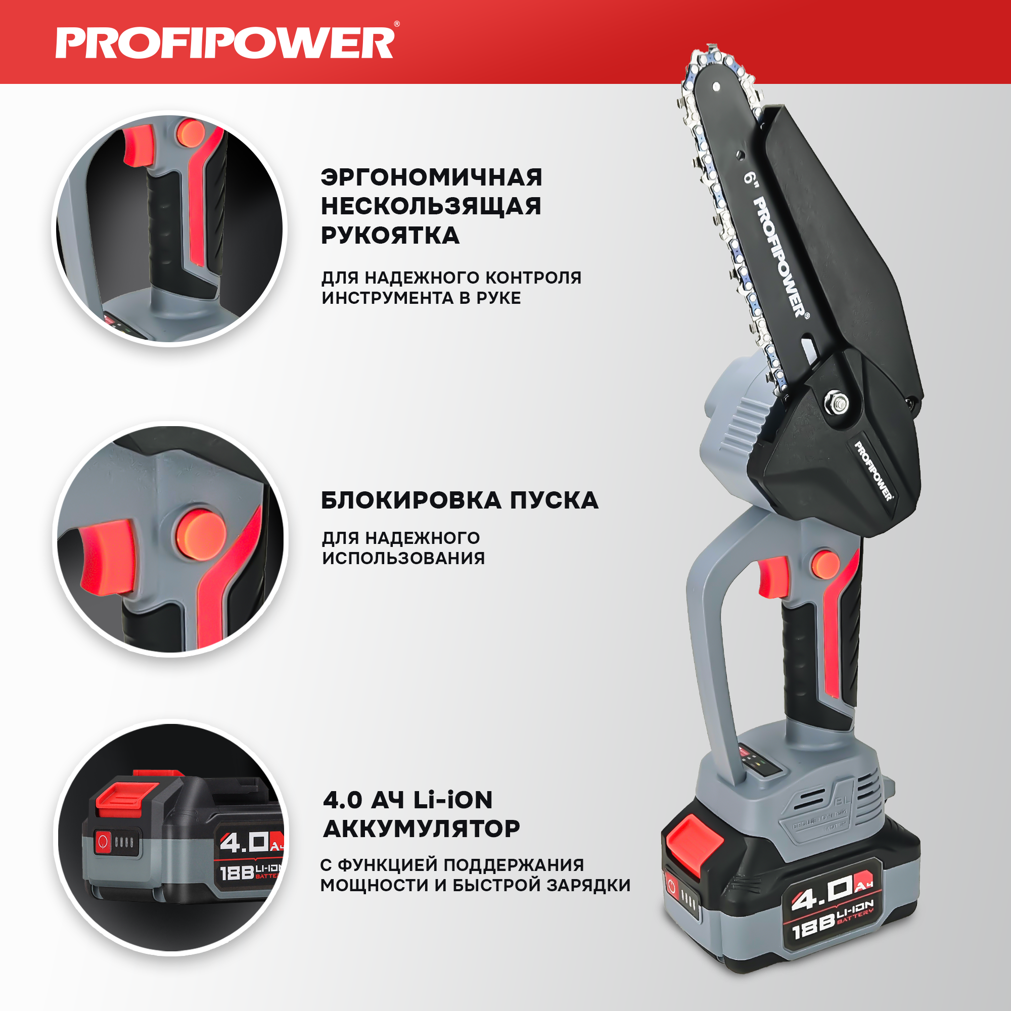 Цепная пила ProfiPower MKGST-18V (Li-ion-1шт, 4.0Ач,15см, 6",0-4500 об/мин,шина, цепь, З/У)