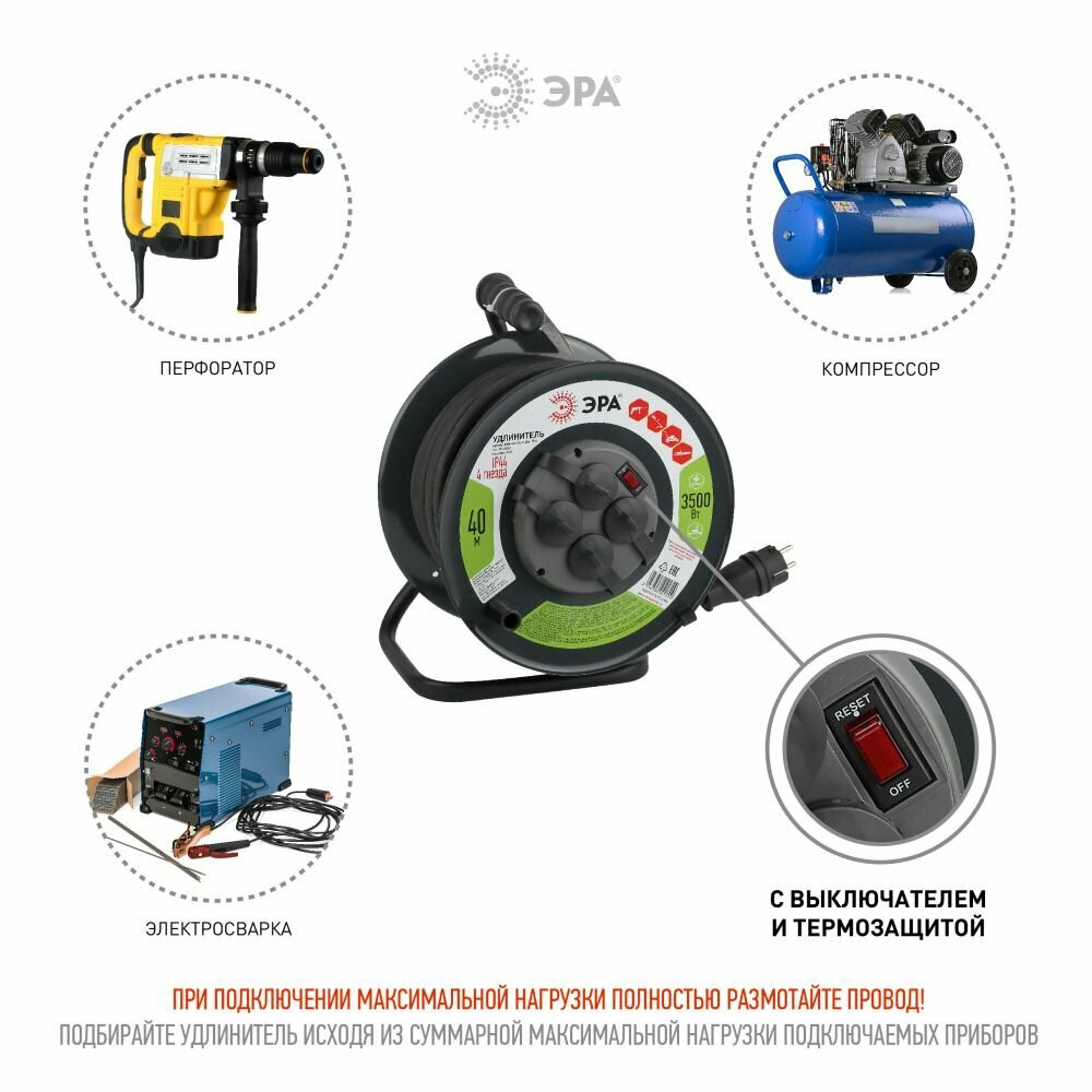ЭРА Удлинитель силовойRMx-4es-3x1.5-40m-IP44(KG) на металлической катушке c заземлением 4 розетки 40м КГ 3х1.5мм2, Б0046848