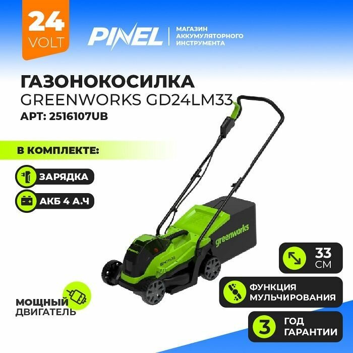 Газонокосилка аккумуляторная GreenWorks GD24LM33K4 33см 24В VT 2516107UB 1хАКБ 4Ач и ЗУ