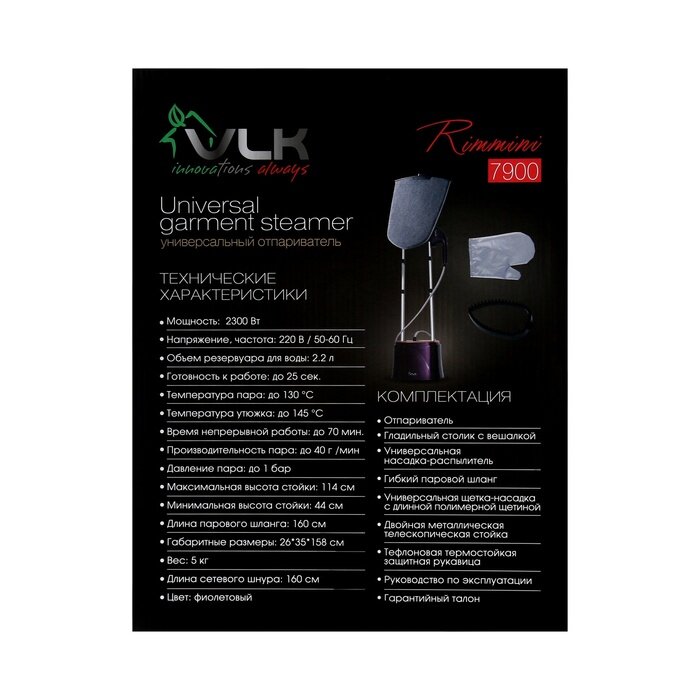 СохранитьVLK Отпариватель VLK Rimmini 7900, напольный, 2300 Вт, 2.2 л, 40 г/мин, фиолетовый интересное: