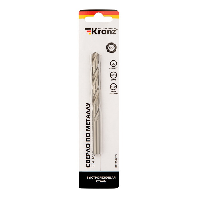 Сверло KRANZ по металлу 9,0 мм повышенной прочности с углом заточки 118 градусов HSS, 1 шт. в упаковке, DIN 338