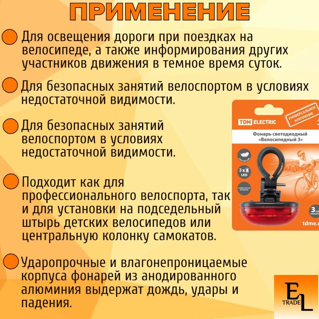 Ниже Вы можете прочитать отзывы на Фонарь Велосипедный светодиодный, 3 режима, 3 LED, 20 лм/Вт, 2*AAA, IP44, 100 метров, TDM, ознакомится с подробными характеристиками, посмотреть интересные обзоры и фотографии на Фонарь Велосипедный светодиодный, 3 режима, 3 LED, 20 лм/Вт, 2*AAA, IP44, 100 метров, TDM.
