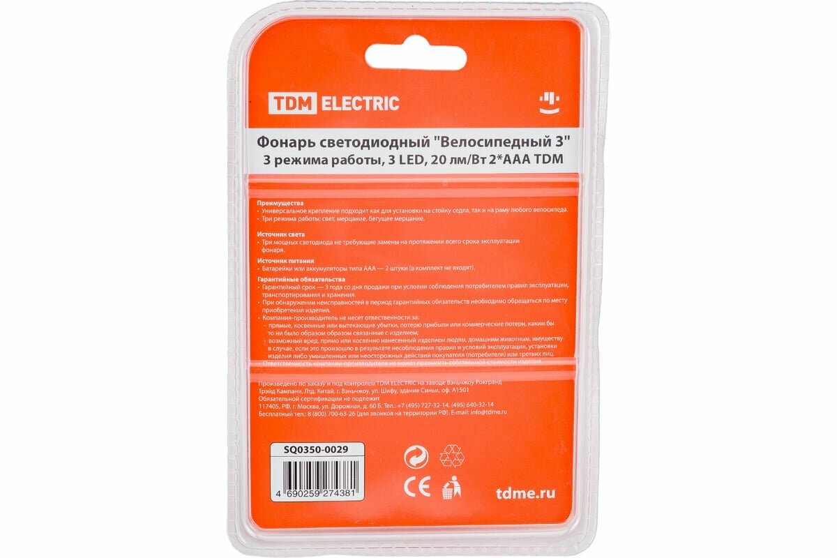 Светодиодный фонарь TDM Велосипедный 3 3 режима работы, 3 LED, 20 лм/Вт 2*AAA SQ0350-0029