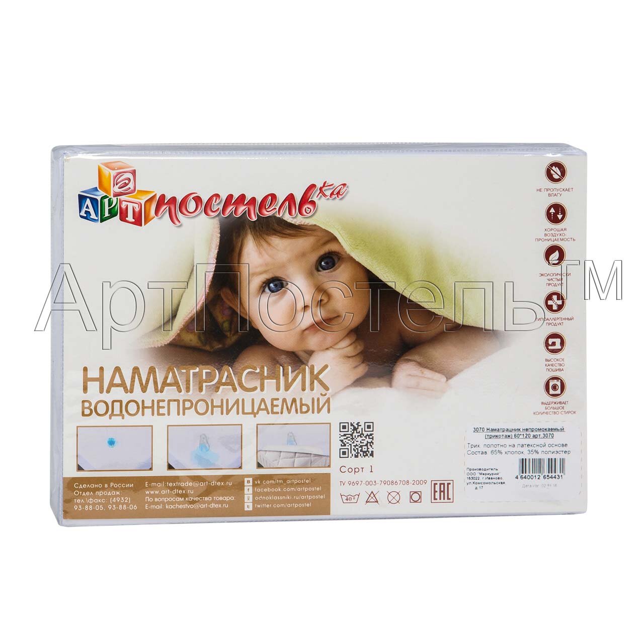 Наматрасник непромокаемый Махровый 60x120х10см, защитный АртПостель, белый на резинке, арт. 3470