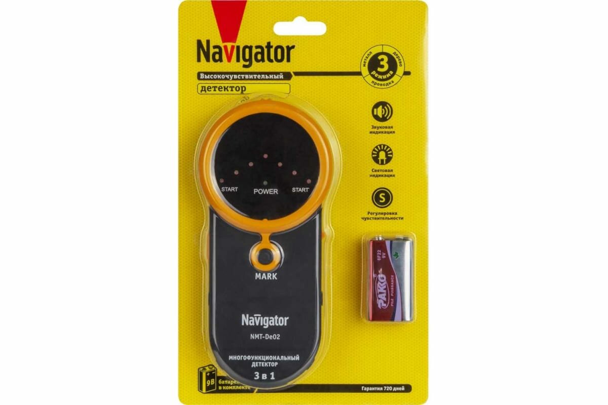 Детектор металла и проводки Navigator 93 621 NMT-De02, с автоотключ, 3 режима работы, на батарейке
