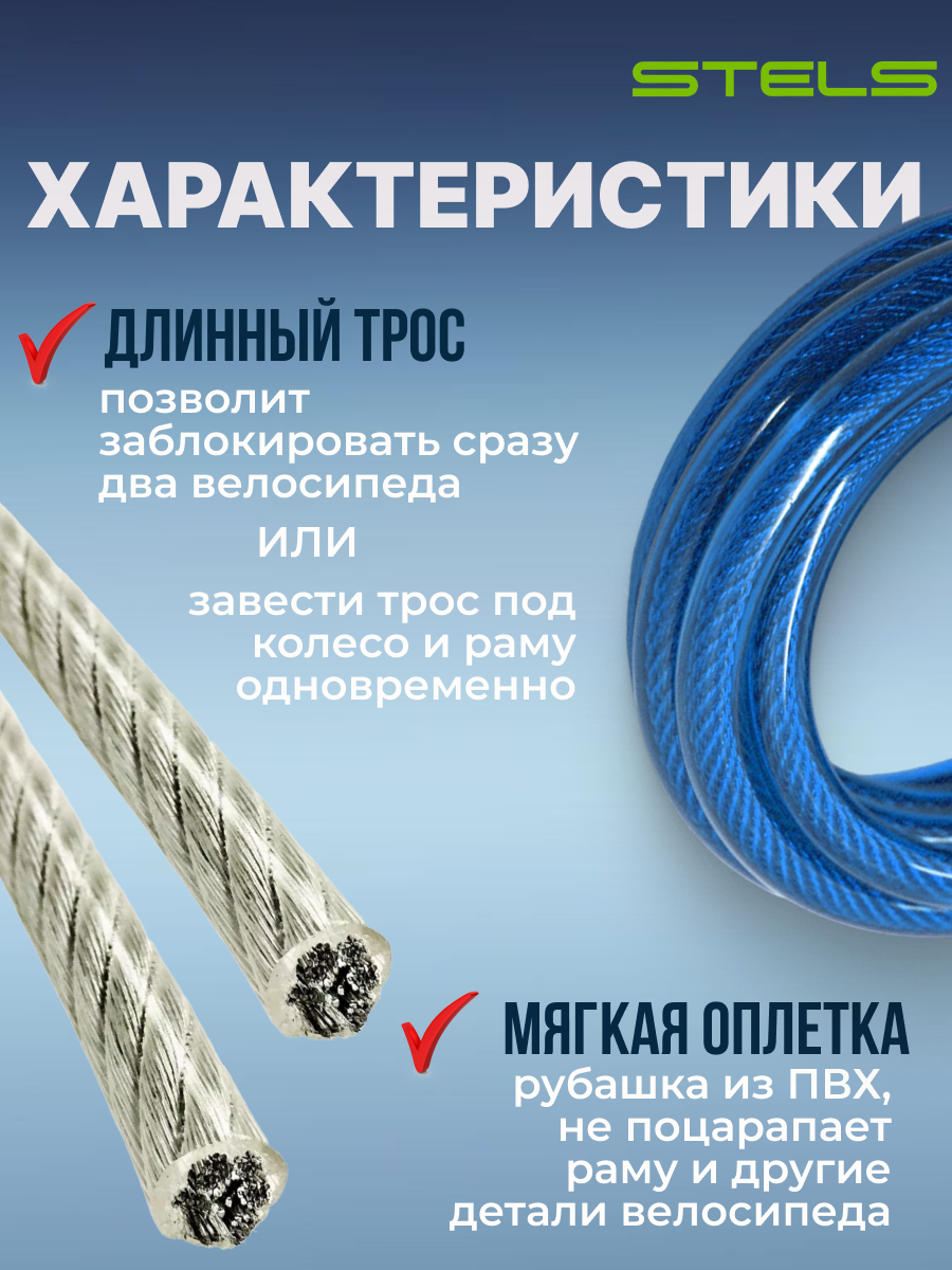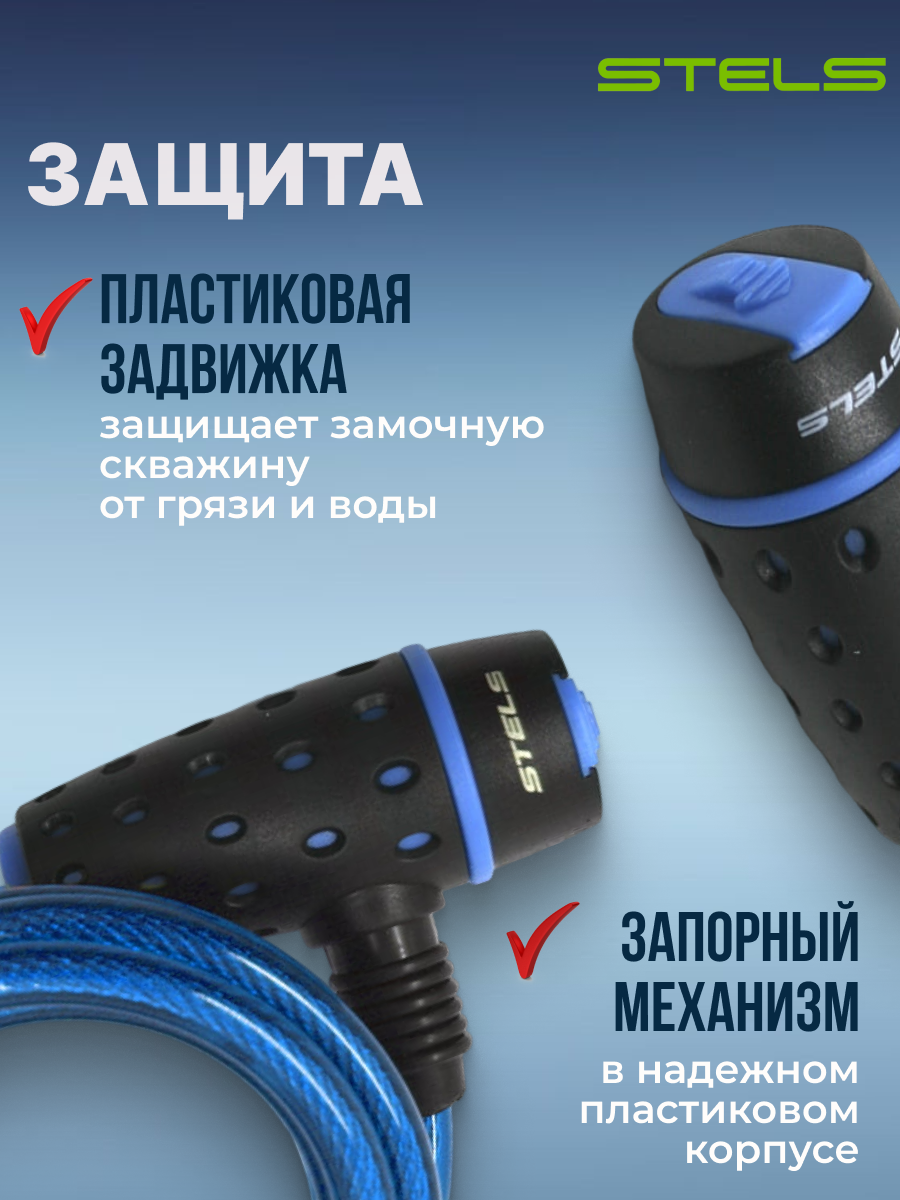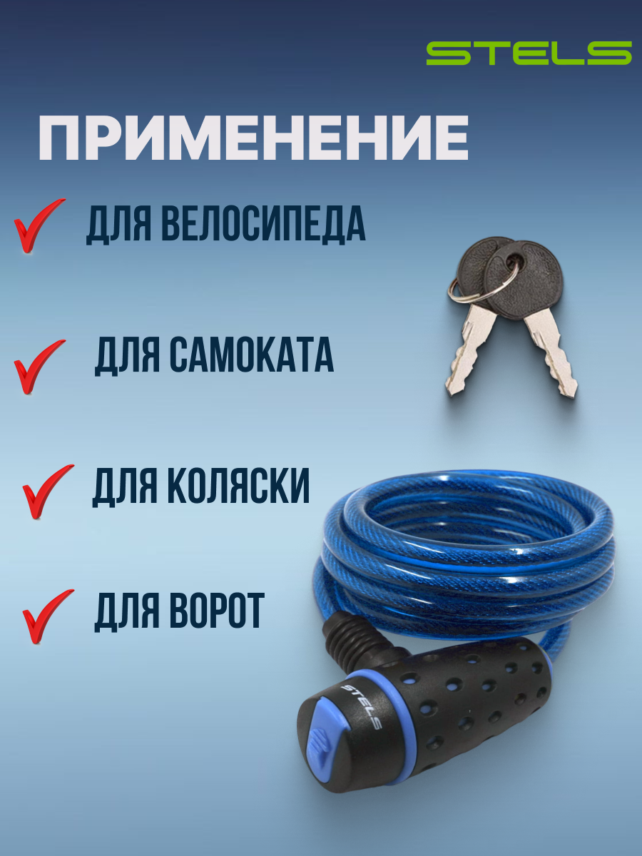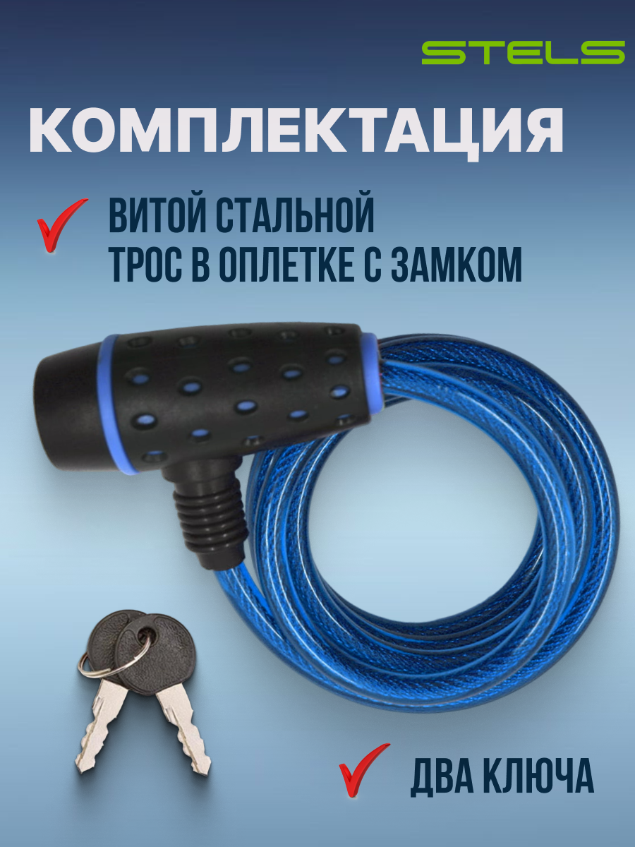 STELS Трос-замок 87318 с ключом со стальн. тросом 8х1800мм, чёрно-синий 540055*LU059791 (Аксессуары для вело-техники)
